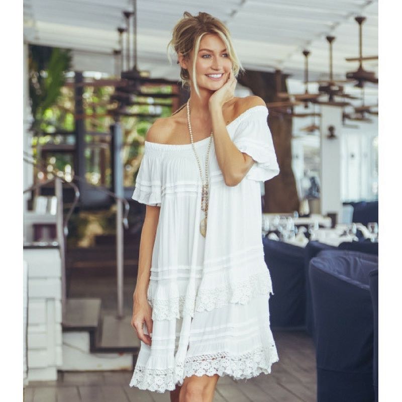 Surf Gypsy White Tiered Off Shoulder Dress with Lace Crochet Trim