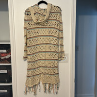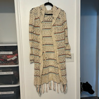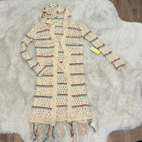 Vintage Havana Fringe Trim Open Knit Maxi Cardigan with Hood