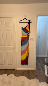 Staud Alpes One Shoulder Cutout Rainbow Crochet Knit Dress