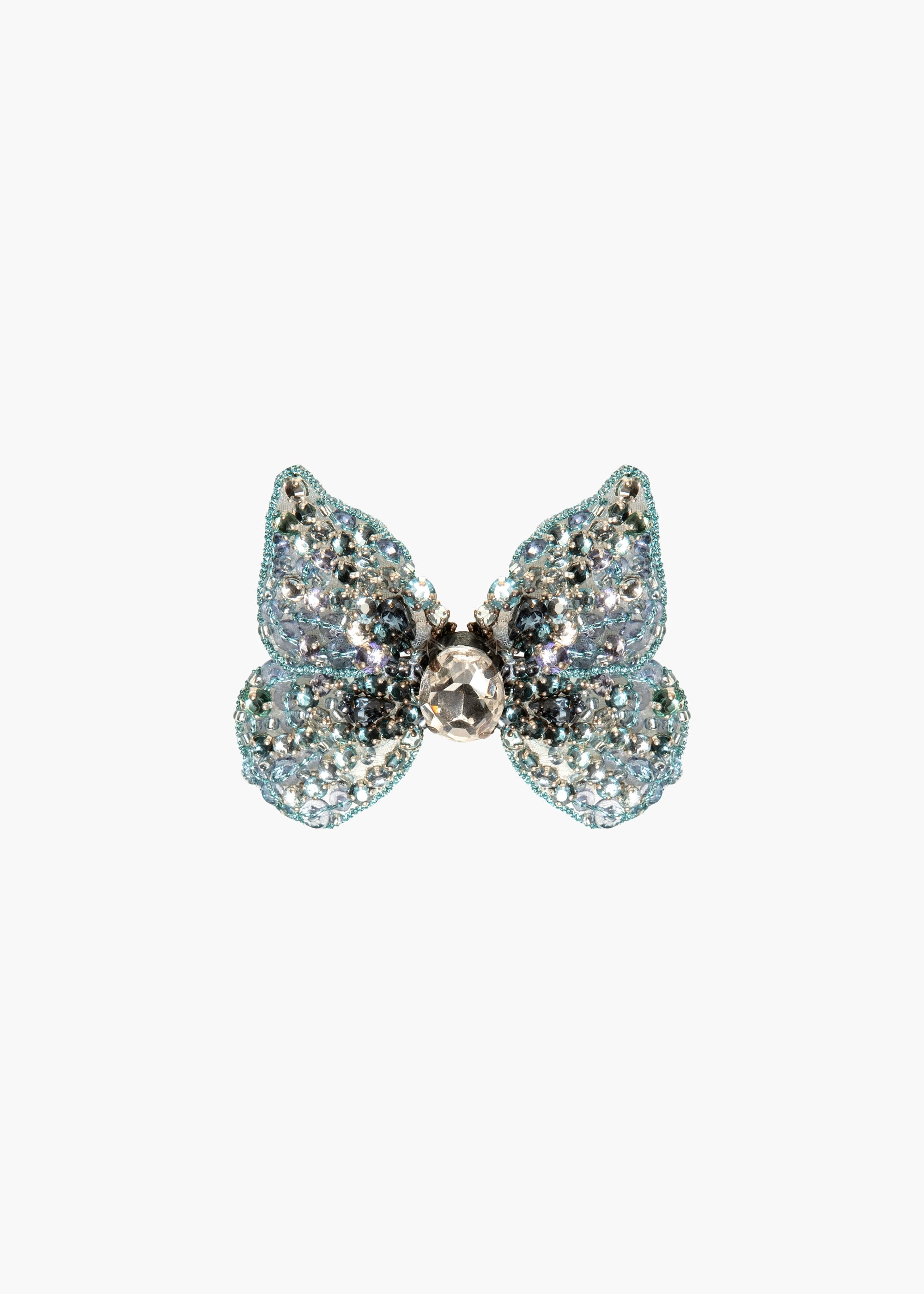 The Abbie Barrette is made by hand in New York, with hand-embroidered Austrian crystals scattered across silk chiffon, dip-dyed to create an ombre effect. The butterfly is wired by hand to create its nuanced, lifelike shape— butterflies are integral to the Jennifer Behr brand, representing spiritual rebirth and connection to the divine. Each one is finished with a French flip clip for secure placement anywhere in the hair— layer multiples at once for a dramatic finished look. Material The Abbie Barrette is made by hand in New York featuring a hand-embroidered Austrian crystal butterfly with French steel flip clip closure. We recommend treating this clip as you would a piece of jewelry, and storing in the dust bag when not in use. Avoid contact with water, perfume, and other chemicals, including hairspray, which should be used before placement in the hair.