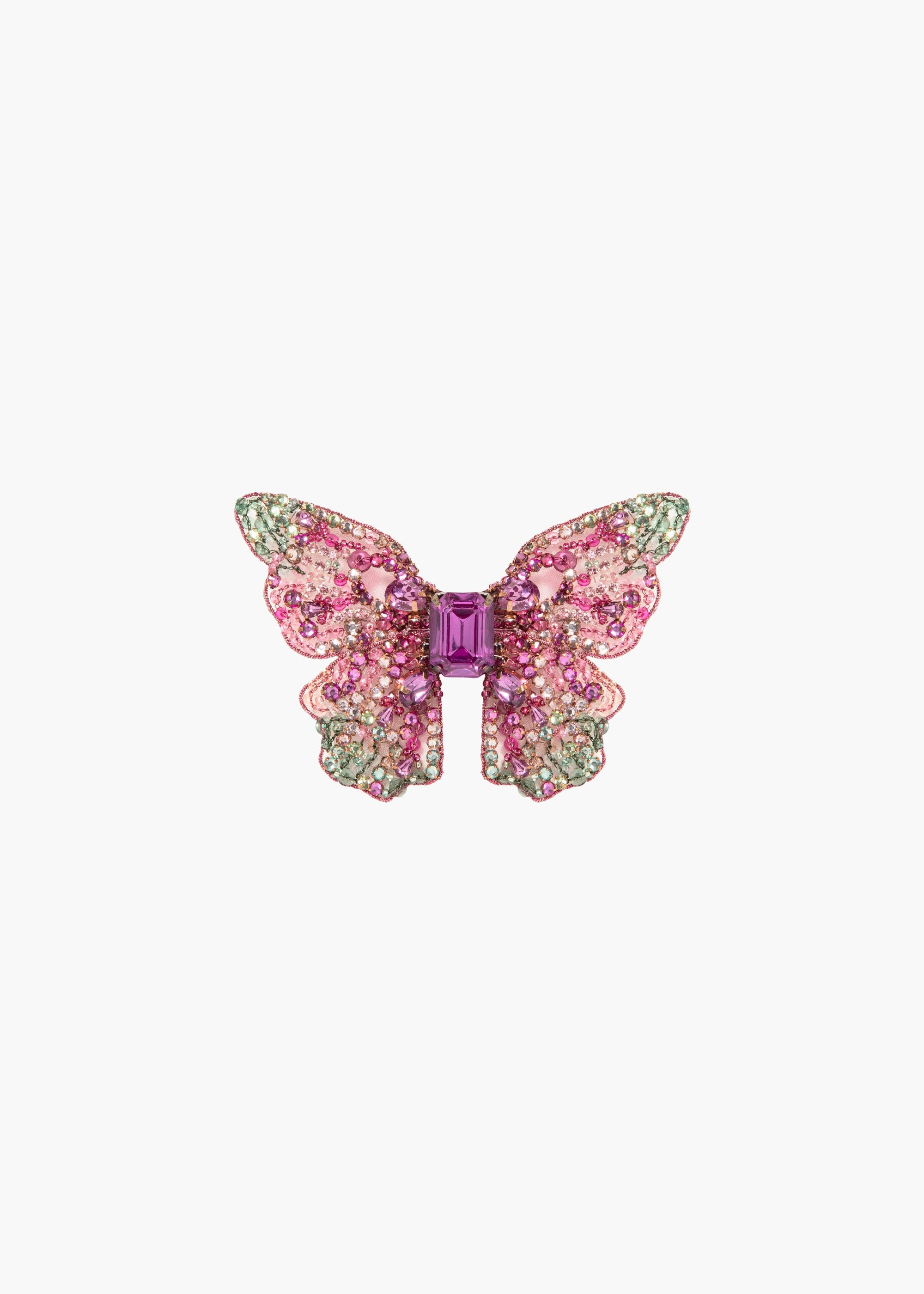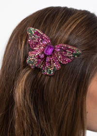 More akin to a piece of fine jewelry than a hair clip, the Absolem Barrette is made by hand in New York, with hand-embroidered Austrian crystals scattered across silk chiffon, dip-dyed to create a vivid ombre effect. Butterflies are iconic emblems of the Jennifer Behr brand, signaling spiritual rebirth and connection to the divine. The butterfly is wired by hand to create the nuanced, lifelike shape, and each one is finished with a French flip clip for secure placement anywhere in the hair— layer multiples at once for a dramatic finished look. Material The Absolem Barrette is made by hand in New York featuring a hand-embroidered Austrian crystal butterfly with French steel flip clip closure. We recommend treating this clip as you would a piece of jewelry, and storing in the dust bag when not in use. Avoid contact with water, perfume, and other chemicals, including hairspray, which should be used before placement in the hair.