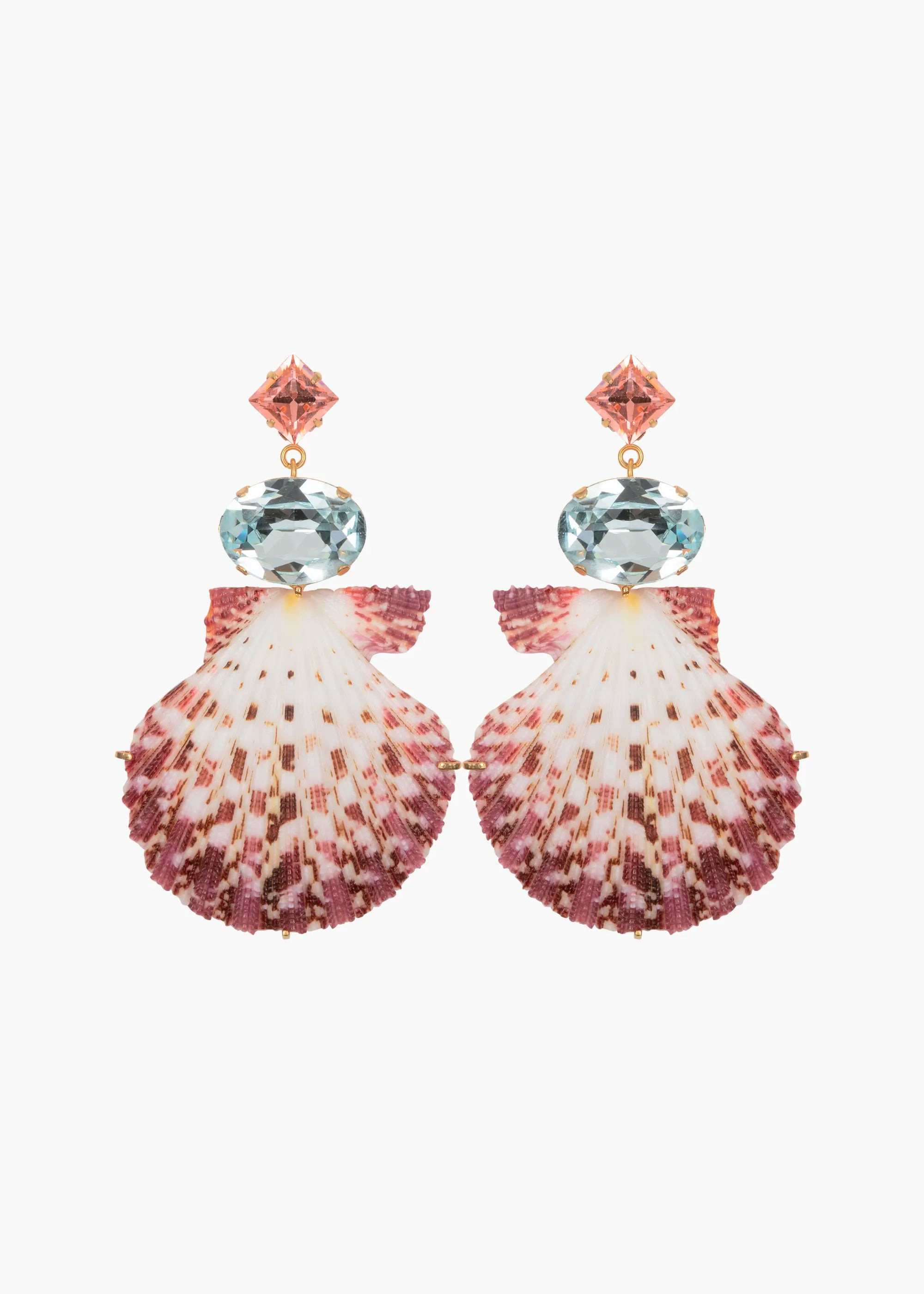 The Aegean Earrings harness the beauty of natural seashells, using genuine Royal Cloak scallop shells. These organic elements are paired with sparkling crystals, forming a palette inspired by the shimmering Aegean Sea. Made by hand in New York, these earrings feature a hand-formed custom setting crafted with time-intensive fine jewelry techniques. Dimensions: 2 7/8 inch length Material The Aegean Earrings are made by hand in New York from Czech crystals and natural seashells. All shells have natural variances in color and markings that make each one unique. They have a surgical-steel post, are nickel-free and safe for sensitive skin. We recommend storing earrings in their dust bag while not in use, and avoiding contact with water, perfume, hairspray, and other chemicals.