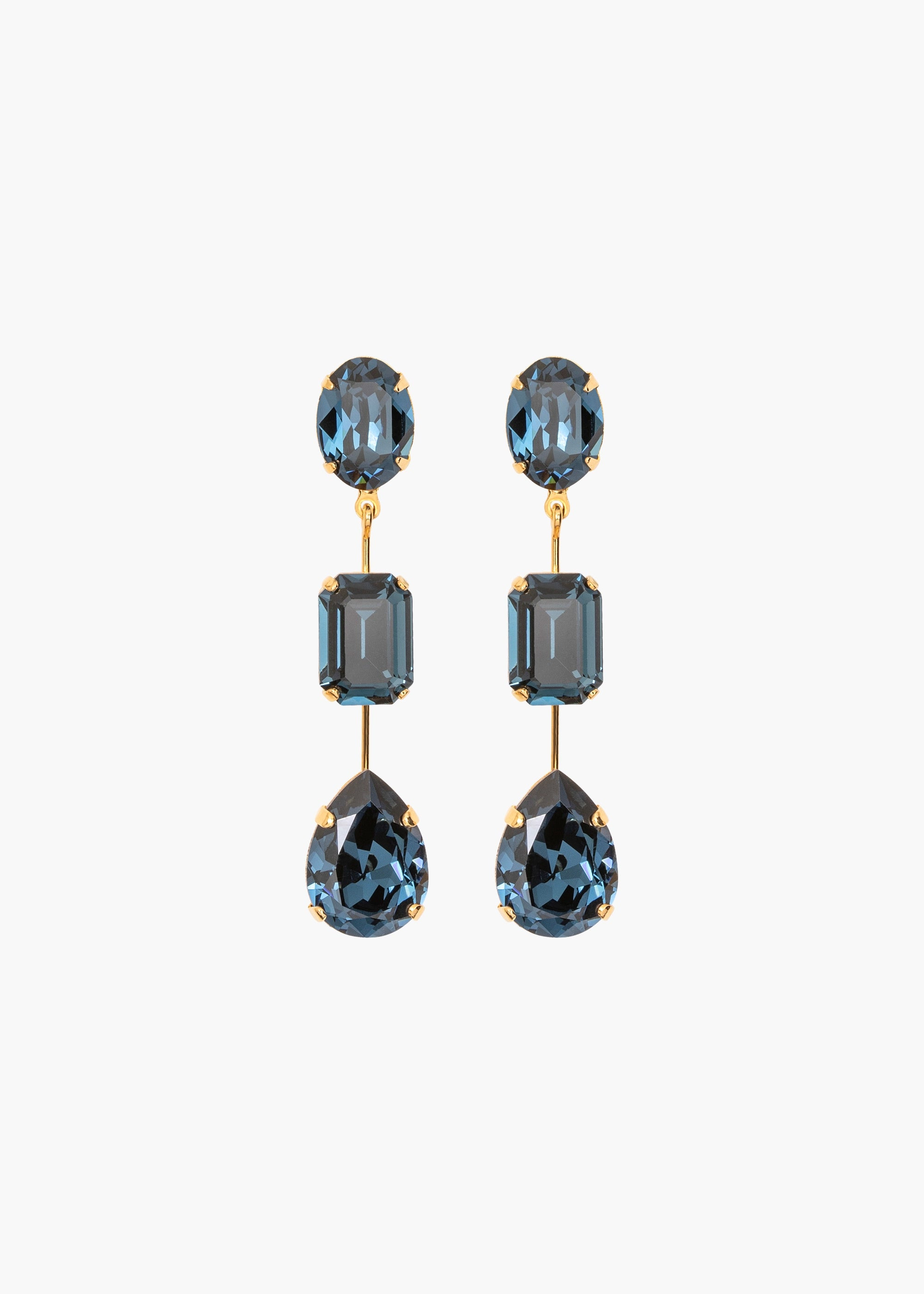 Inspired by Renaissance gems, the Allanah Earring features noteworthy, oversized stones. The three glass crystals of varying shapes catch the light and create magnificent sparkle. These earrings are very lightweight, as they're made by hand for comfort and mobility. Material The Allanah Earring is a post earring with a surgical-steel post. Our earrings are nickel-free and safe for sensitive skin. These earrings are crafted by hand in New York from crystals and plated brass. We recommend storing earrings in their dust bag while not in use, and avoiding contact with water, perfume, hairspray, and other chemicals.