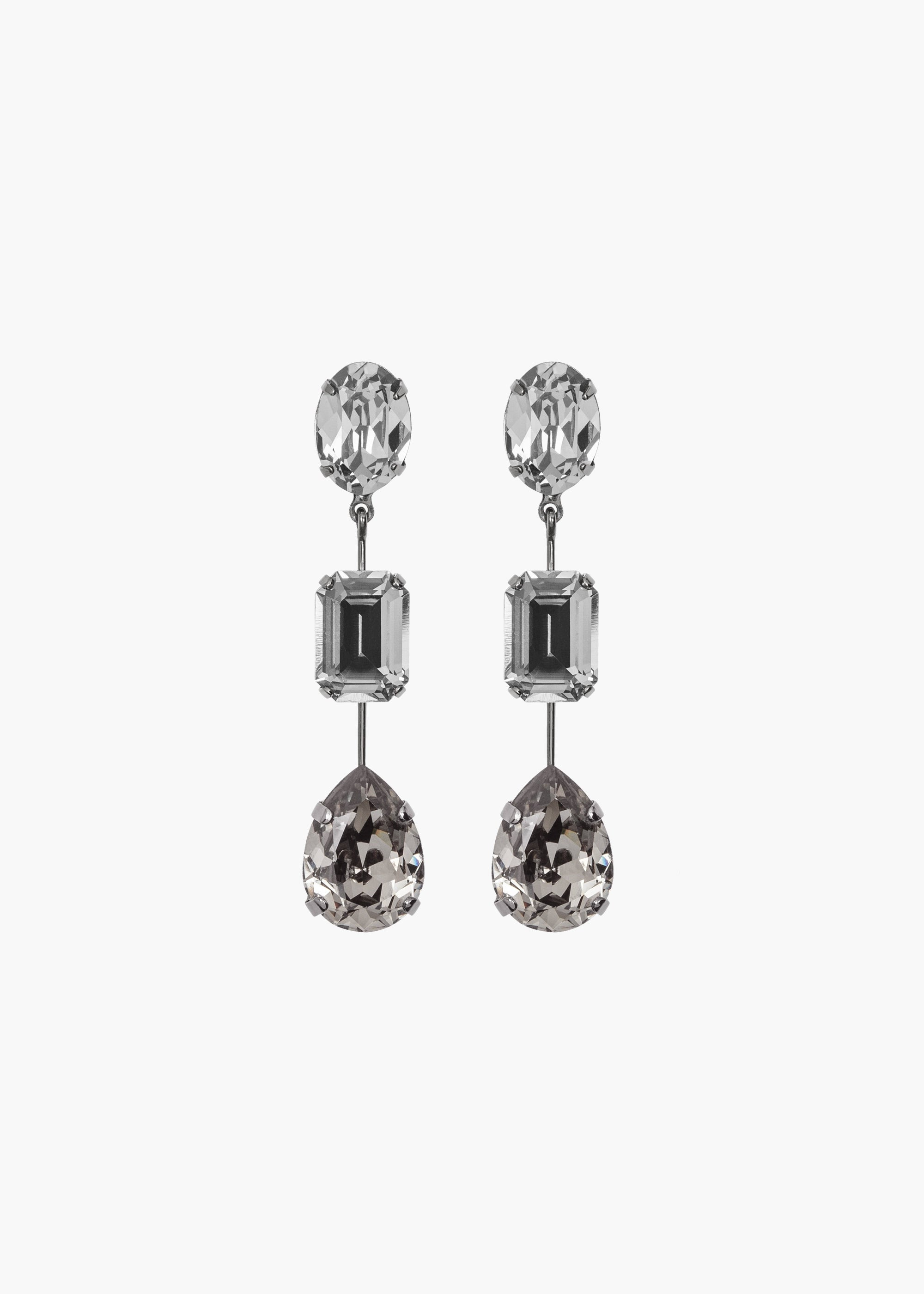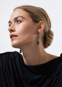 Inspired by Renaissance gems, the Allanah Earring features noteworthy, oversized stones. The three glass crystals of varying shapes catch the light and create magnificent sparkle. These earrings are very lightweight, as they're made by hand for comfort and mobility. Material The Allanah Earring is a post earring with a surgical-steel post. Our earrings are nickel-free and safe for sensitive skin. These earrings are crafted by hand in New York from crystals and plated brass. We recommend storing earrings in their dust bag while not in use, and avoiding contact with water, perfume, hairspray, and other chemicals.