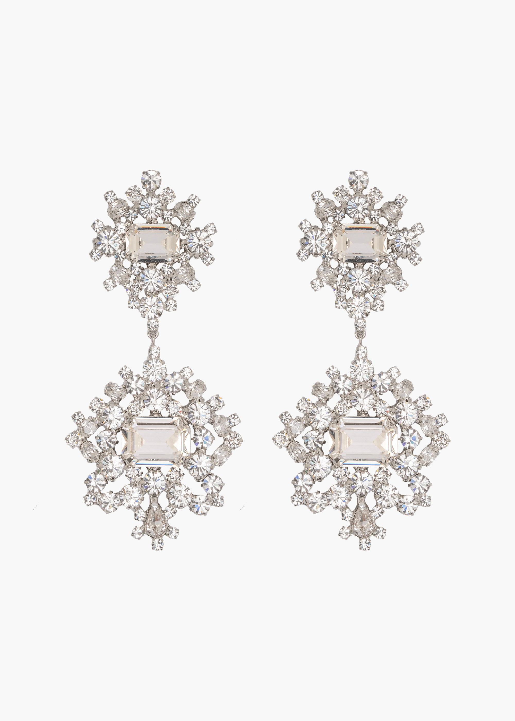 A true objet d'art, the Angelica Earrings boast a museum-worthy sculptural design. Fine crystals form a delicate web, centering upon a radiant emerald-cut stone. Made by hand in New York, the movement of this statement earring is undeniably dramatic. Material The Angelica Earrings is a post earring with a surgical-steel post. Our earrings are nickel-free and safe for sensitive skin. These earrings are made by hand in New York, from gem-cut Czech crystals. We recommend storing earrings in their dust bag while not in use, and avoiding contact with water, perfume, hairspray, and other chemicals.