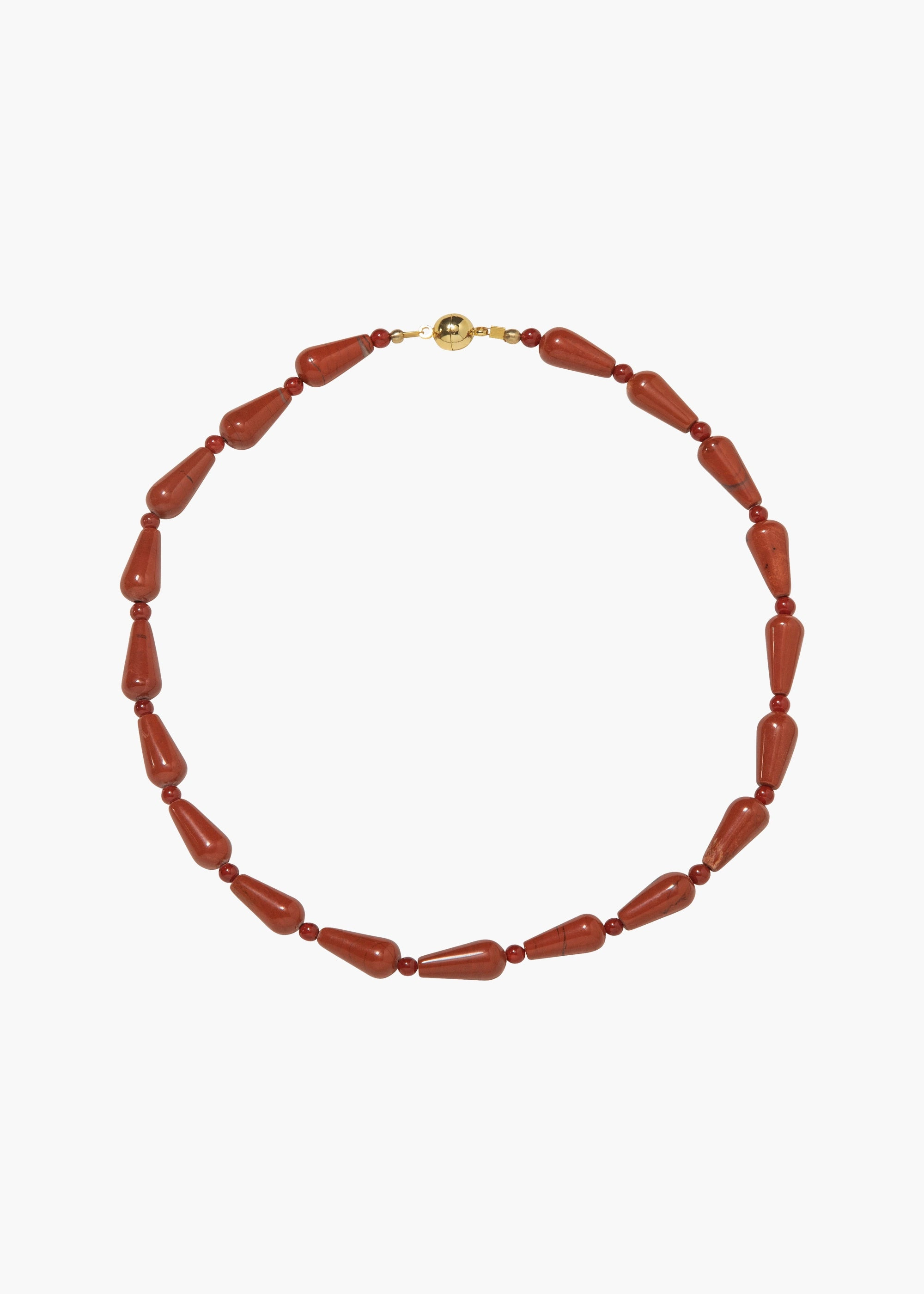 Harnessing the power of natural gemstones, the Anisha Necklace features semi-precious jasper, a stone historically used as a protective talisman. Made by hand in New York, unusual elongated pear-shaped beads are punctuated with smaller round stones, and finished with an 18-karat gold-plated magnetic clasp. We love this jasper gemstone necklace layered with other carnelian and garnet pieces available in our collection. Dimensions: 16.5" length Material The Anisha Necklace is handmade in New York of semiprecious gemstones with a 18K gold plated magnetic closure. All stones have natural variances in color and markings that make each one unique. We recommend storing necklaces in their dust bag while not in use, and avoiding contact with water, perfume, hairspray, and other chemicals.