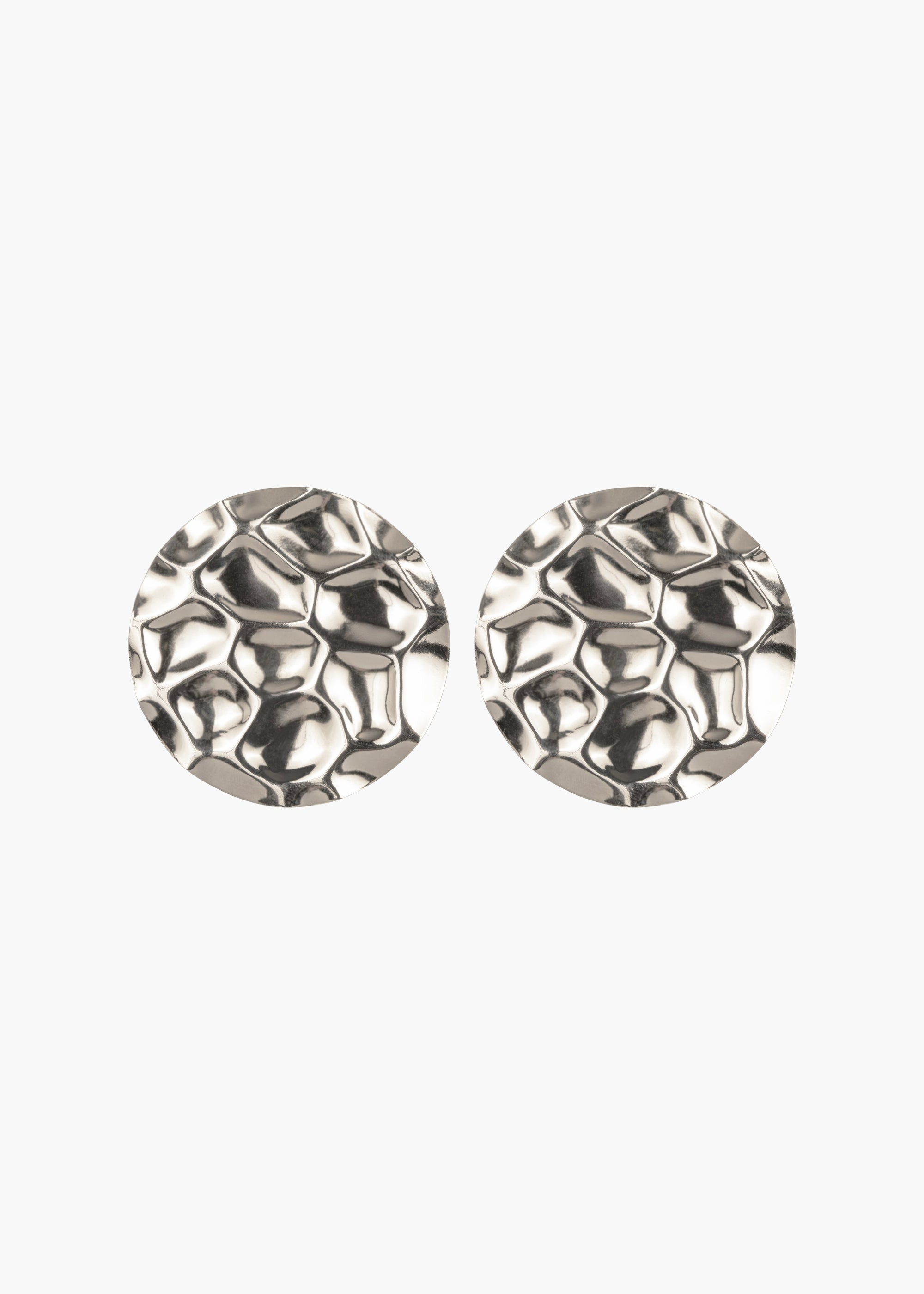 A singular conversation piece, the Azra Earrings are a dramatic disc earring. These sculptural earrings feature a hammered surface, sending boosts of shine in every direction. They are uniquely crafted by hand of a single flat sheet of brass, making them remarkably lightweight for their size. Material The Azra Earrings are made by hand in New York from 18K gold or rhodium plated brass. They have a surgical-steel post, are nickel-free, and safe for sensitive skin. We recommend storing earrings in their dust bag while not in use, and avoiding contact with water, perfume, hairspray, and other chemicals.