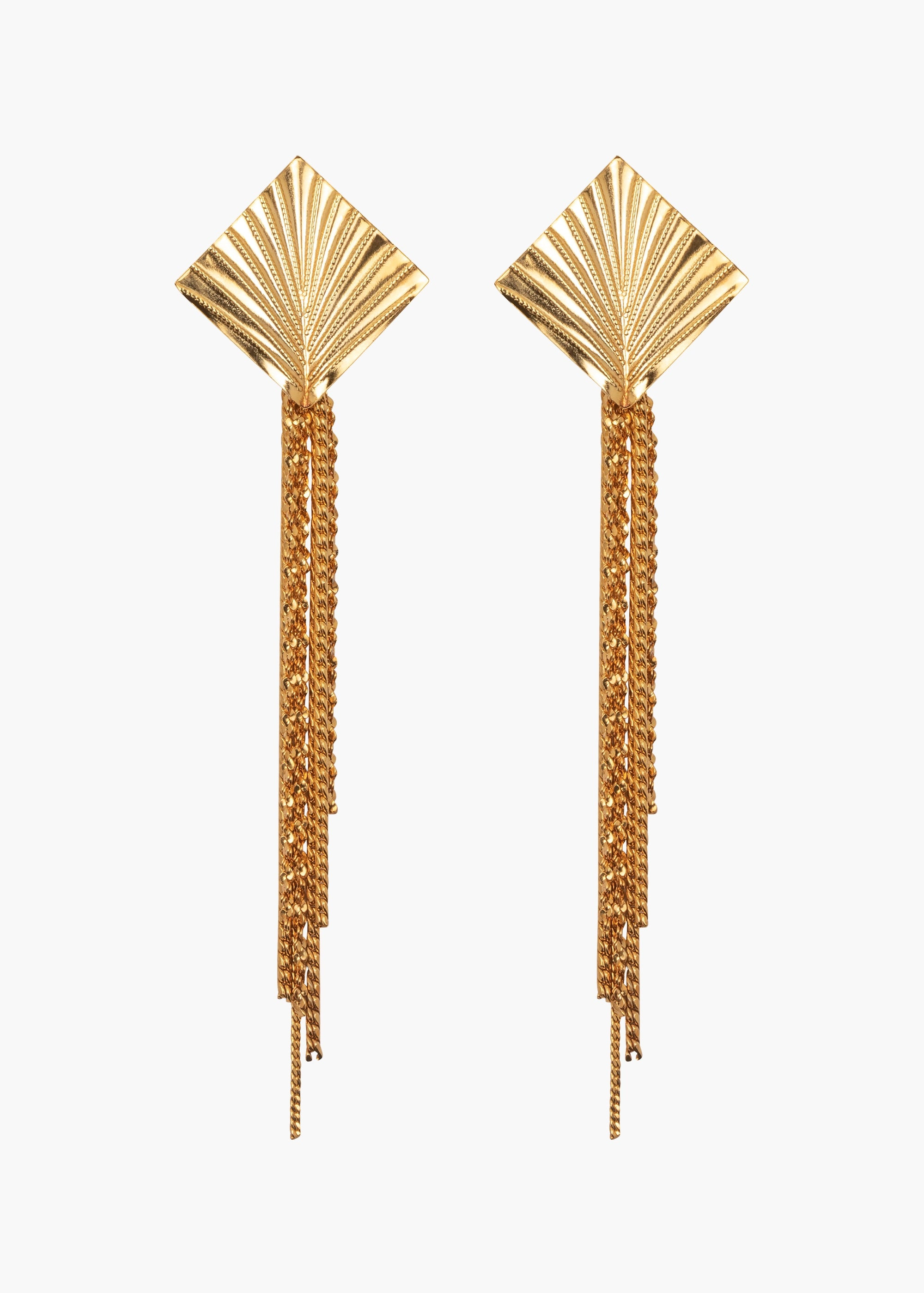 Inspired by Art Deco architecture, the Bexley Earrings combine the fluting and pyramid themes that defined that era with cascading chains that feel undeniably festive. Made by hand in New York and finished with 18-karat gold or rhodium plating, the fine chain fringe adds drama and movement, without weight. The shoulder-grazing fringe provides a flattering elongating effect. Dimensions: 5" length, 1.5" width Material The Bexley Earrings are made by hand in New York from 18K gold plated brass. They have a surgical-steel post, are nickel-free and safe for sensitive skin. We recommend storing earrings in their dust bag while not in use, and avoiding contact with water, perfume, hairspray, and other chemicals.