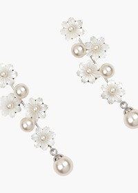 The Calissa Earring is a dainty, dangling style, comprised of small hand-carved mother of pearl flowers and crystal pearls. We love mother of pearl for its natural iridescence, and the magical way it catches the light. Combined with the graceful movement of these drops, it creates a flattering glow you won't want to be without. Material The Calissa Earring is a post earring with a surgical-steel post. Our earrings are nickel-free and safe for sensitive skin. These earrings are crafted by hand in New York from mother of pearl and pearl. We recommend storing earrings in their dust bag while not in use, and avoiding contact with water, perfume, hairspray, and other chemicals.