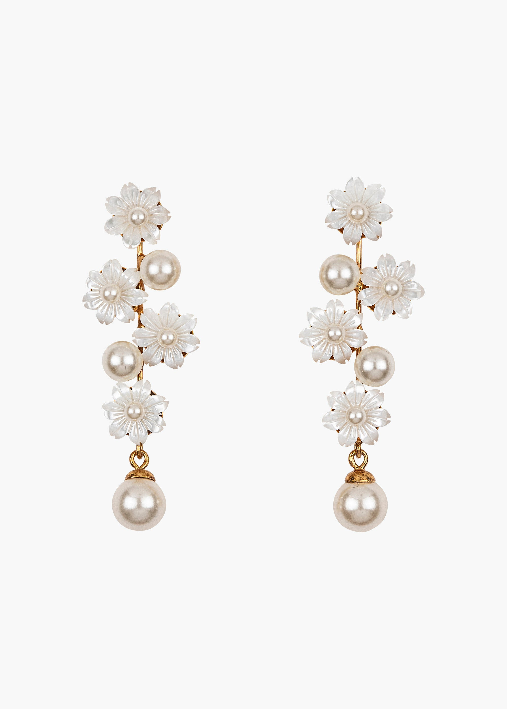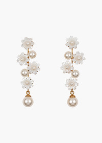 The Calissa Earring is a dainty, dangling style, comprised of small hand-carved mother of pearl flowers and crystal pearls. We love mother of pearl for its natural iridescence, and the magical way it catches the light. Combined with the graceful movement of these drops, it creates a flattering glow you won't want to be without. Material The Calissa Earring is a post earring with a surgical-steel post. Our earrings are nickel-free and safe for sensitive skin. These earrings are crafted by hand in New York from mother of pearl and pearl. We recommend storing earrings in their dust bag while not in use, and avoiding contact with water, perfume, hairspray, and other chemicals.