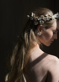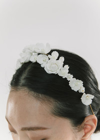 Innovative artistry is on full display in the breathtaking Cameryn Tiara. Made in New York, each polymer clay bloom is pressed by hand to resemble roses, pansies, and other flowers found in nature; they sit on a flexible wire headband base, with added height at the apex. The look can be amplified by adding the Karissa Bobby Pin Set and Cameryn Bobby Pin Set, and the Karissa Earrings will finish the look. Dimensions: 1.75" in height, 9.5". in length Material The Cameryn Tiara is made in New York of 18K gold plated brass and Ukrainian hand pressed polymer flowers on a thin and flexible headband, which is designed to disappear in the hair and ensure hours of comfort. We recommend treating this headband as you would a piece of jewelry, and storing in the dust bag when not in use. Avoid contact with water, perfume, and other chemicals, including hairspray, which should be used before placement in the hair.