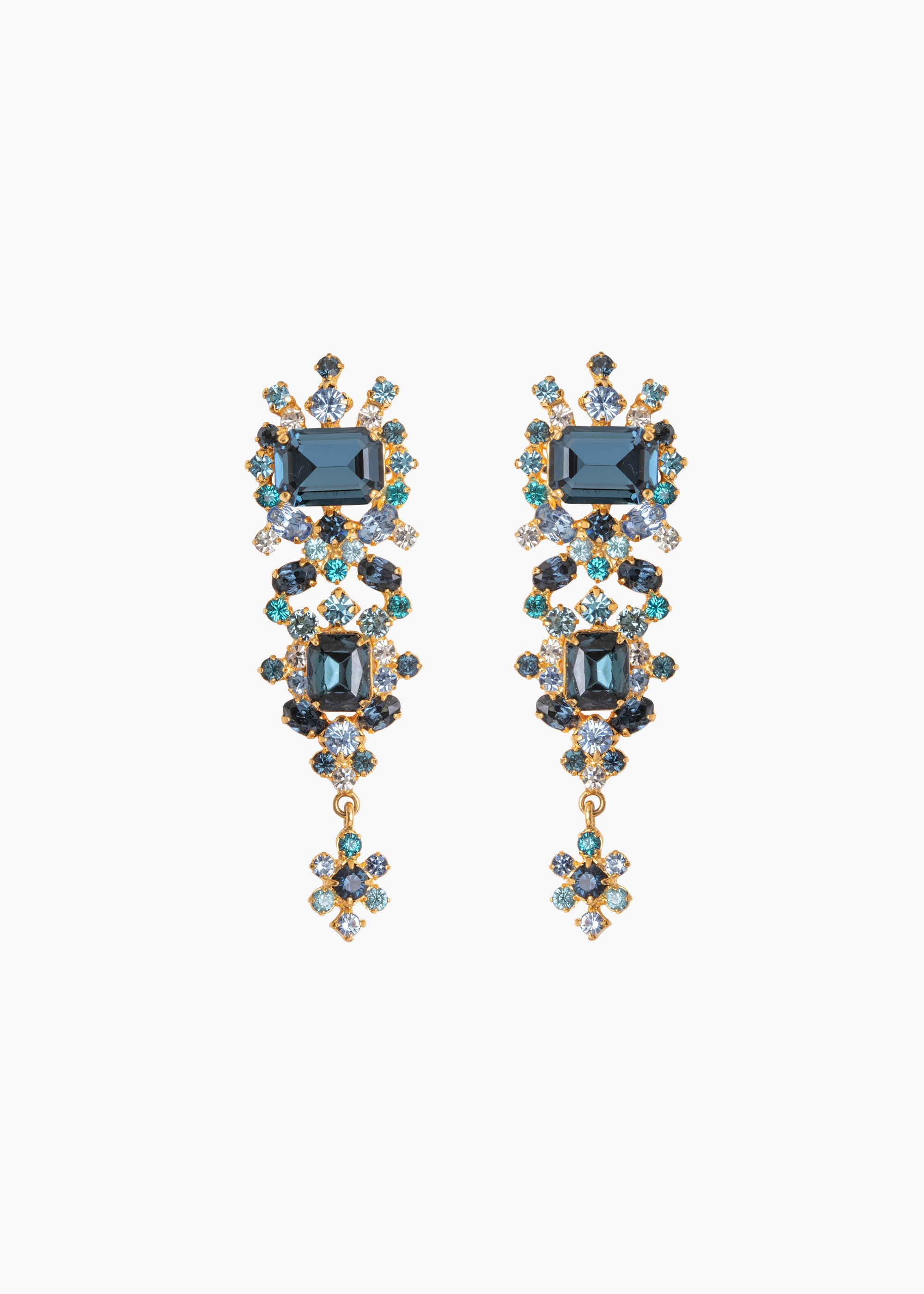 The Cadence Earrings are a royal-worthy statement for modern times. Made by hand in New York, these fine crystals go to statement-making lengths, with jagged edges drawing emphasis to the stunning emerald-cut stones. Their noteworthy sparkle is only enhanced by their graceful movement. Material The Cadence Earring is a post earring with a surgical-steel post. Our earrings are nickel-free and safe for sensitive skin. These earrings are made by hand in New York, from 18k gold plated gem-cut Czech crystals. We recommend storing earrings in their dust bag while not in use, and avoiding contact with water, perfume, hairspray, and other chemicals.