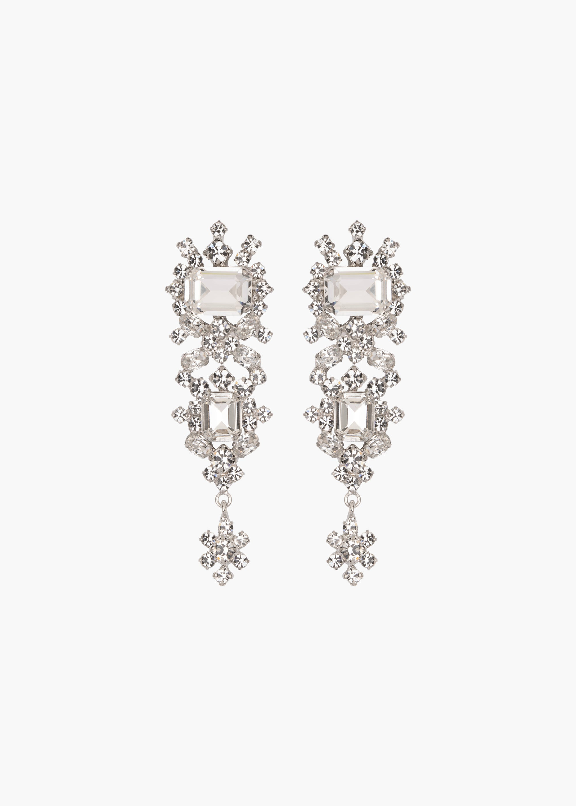 The Cadence Earrings are a royal-worthy statement for modern times. Made by hand in New York, these fine crystals go to statement-making lengths, with jagged edges drawing emphasis to the stunning emerald-cut stones. Their noteworthy sparkle is only enhanced by their graceful movement. Material The Cadence Earring is a post earring with a surgical-steel post. Our earrings are nickel-free and safe for sensitive skin. These earrings are made by hand in New York, from 18k gold plated gem-cut Czech crystals. We recommend storing earrings in their dust bag while not in use, and avoiding contact with water, perfume, hairspray, and other chemicals.