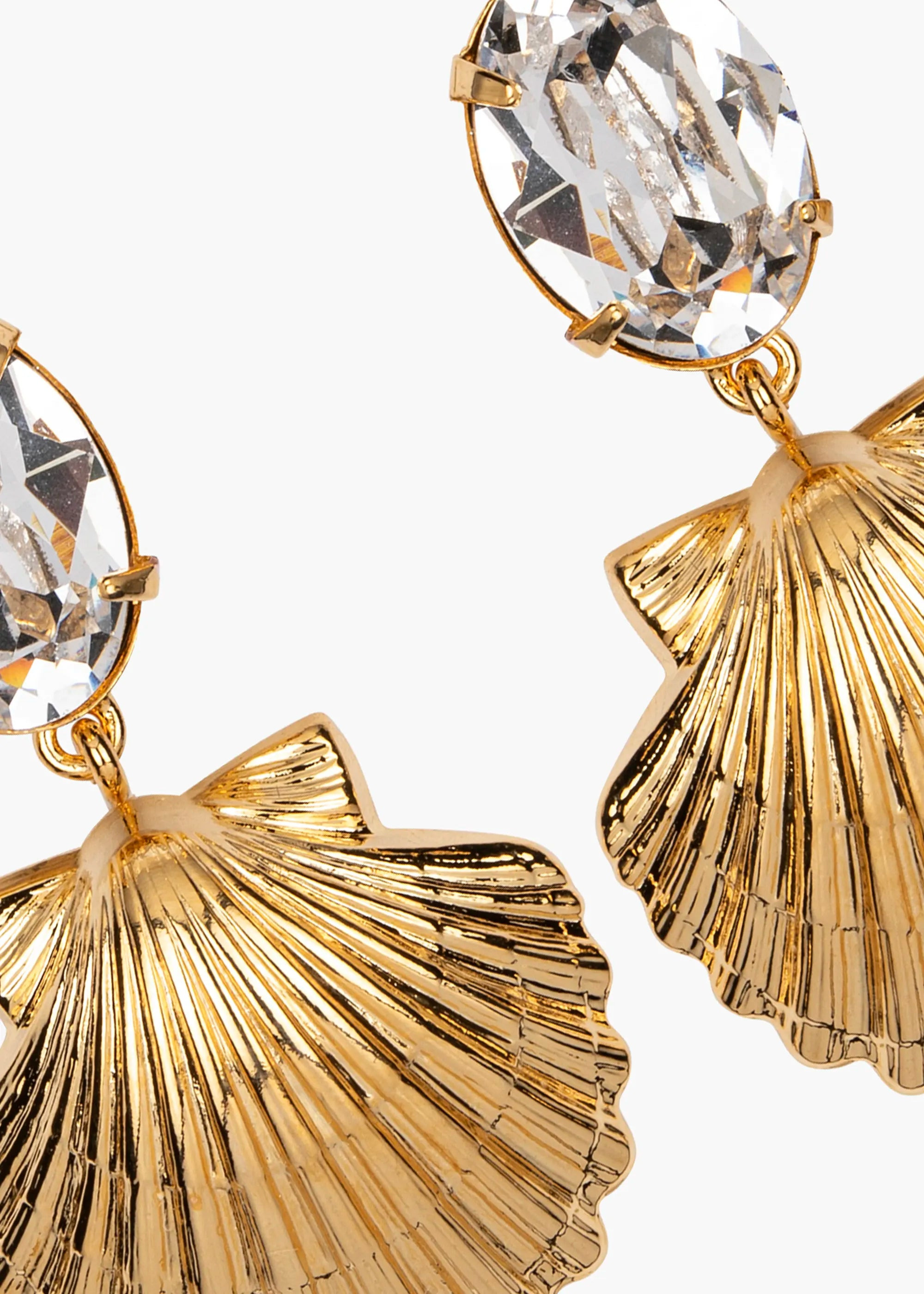 The Capesante Earrings are highly wearable drops with effortless charm. The 18-karat gold-plated scallop shell drop is rich with textural details, suspended from a sun-catching fine crystal. Made by hand in New York, these earrings are designed to be seamlessly layered with our seashell necklace collection. Dimensions: 1 5/8 inch length Material The Capesante Earrings are made by hand in New York from Czech crystal and 18K gold plated brass. They have a surgical-steel post, are nickel-free and safe for sensitive skin. We recommend storing earrings in their dust bag while not in use, and avoiding contact with water, perfume, hairspray, and other chemicals.
