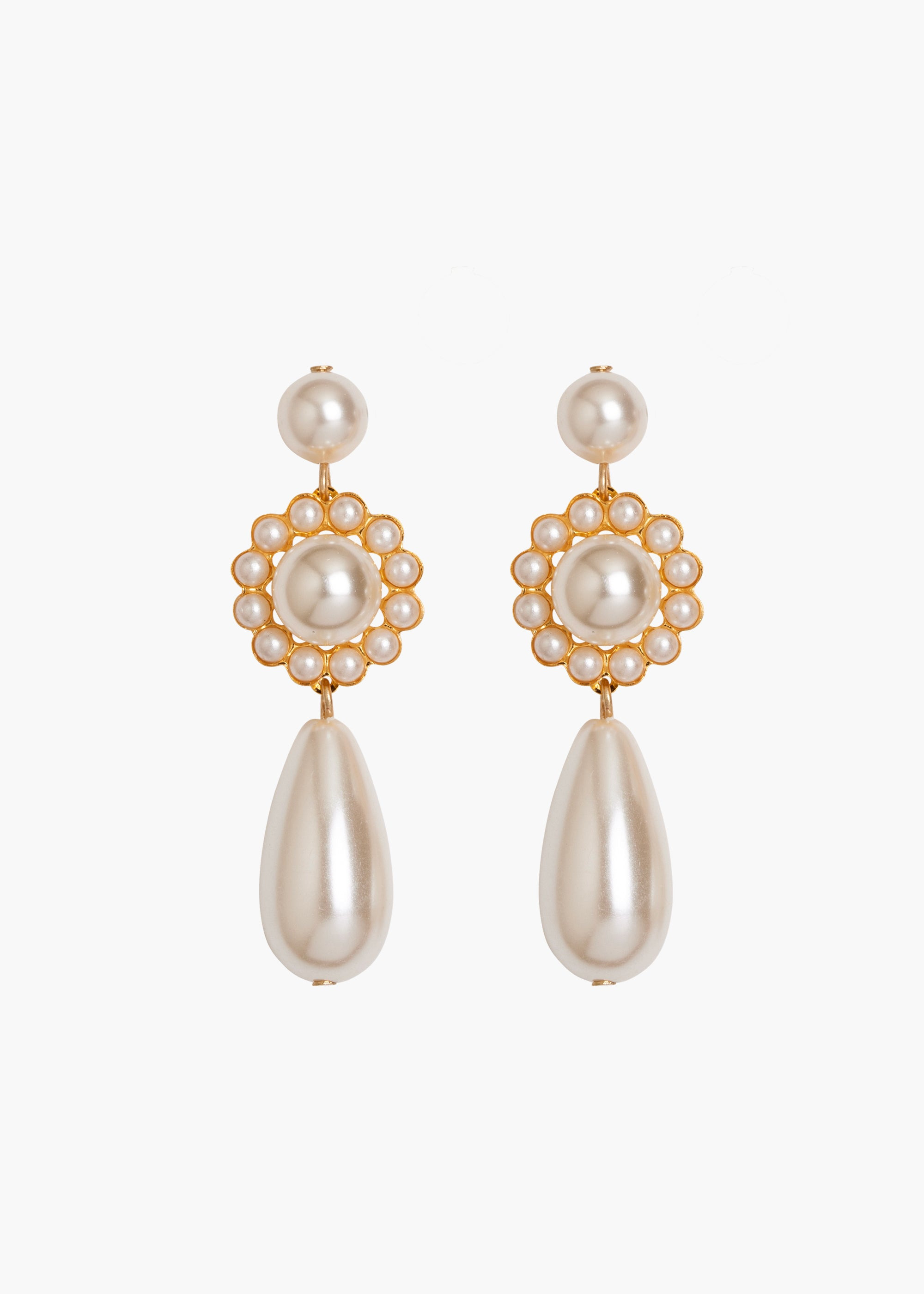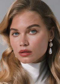 The Caretta Earrings are a uniquely streamlined take on a silhouette borrowed from antique Victorian jewels. These fresh earrings are crafted with a monochromatic palette of crystal pearls, carefully selected to mimic a natural pearl, with the same color and shine. Dual drops make for double the enchanting movement. Dimensions: 2.25" length. Material The Caretta Earrings are made by hand in New York, from 18K gold plated brass and czech crystal pearls. They have a surgical-steel post, are nickel-free, and safe for sensitive skin. We recommend storing earrings in their dust bag while not in use, and avoiding contact with water, perfume, hairspray, and other chemicals.