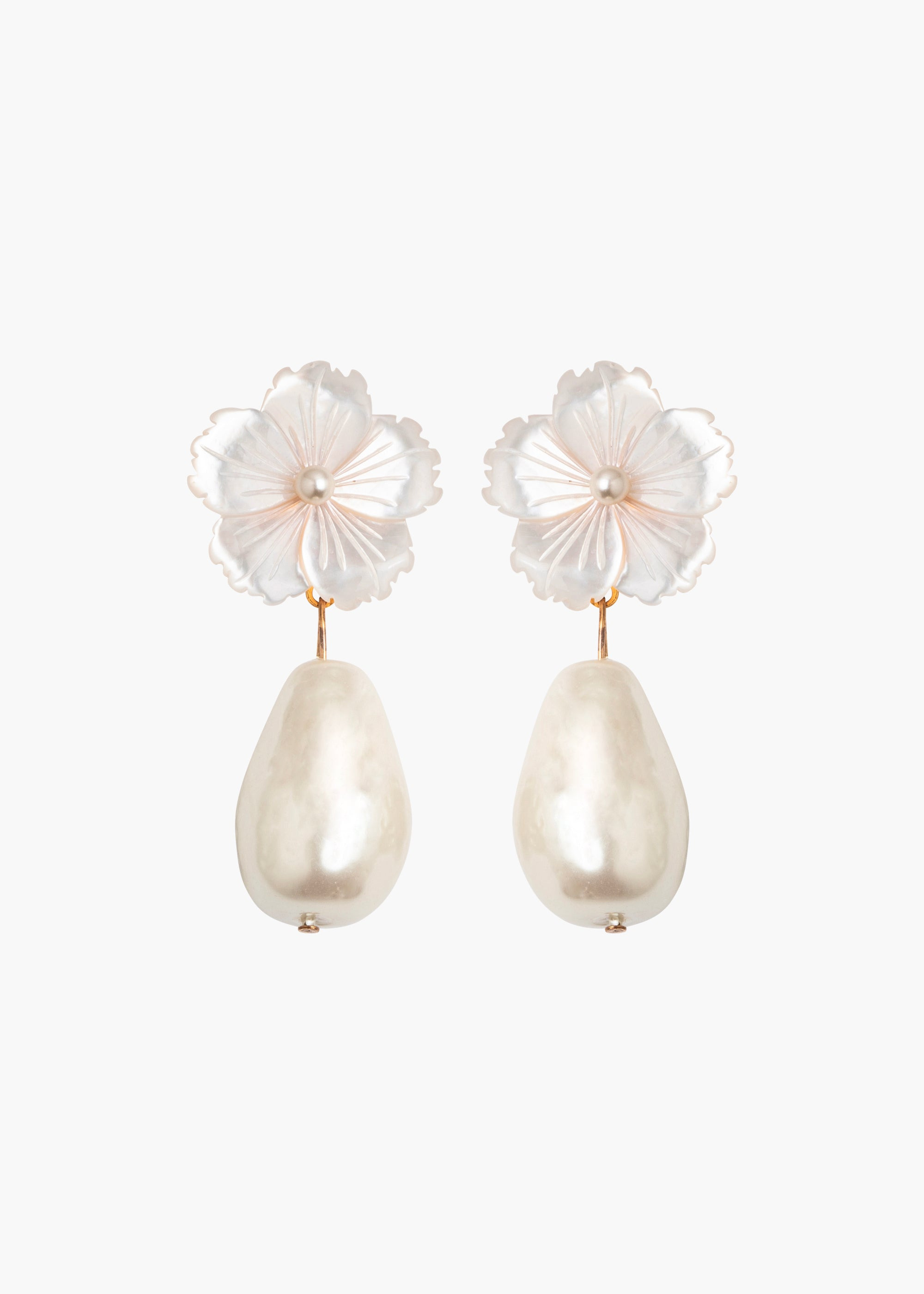 Thoughtfully designed to light up a room, the Carlla Earrings feature a handmade baroque-style Japanese cotton pearl, which took months to source to complete the vintage-inspired look. The mother of pearl's natural opalescence plays off the pearl's alluring sheen beautifully. These earrings pair well with our mother of pearl hair accessories. Dimensions: 1.75" length. Material The Carlla Earrings are made by hand in New York from 18K gold plated brass and mother of pearl flowers. They have a surgical-steel post, are nickel-free, and safe for sensitive skin. We recommend storing earrings in their dust bag while not in use, and avoiding contact with water, perfume, hairspray, and other chemicals.