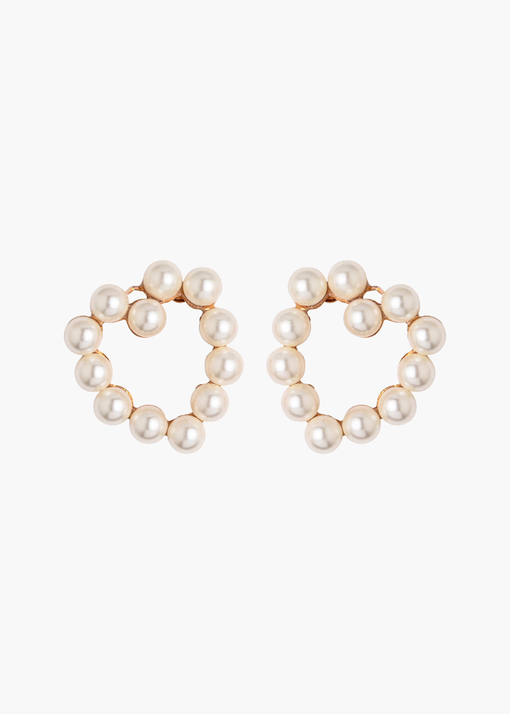 At once elegant and playful, the Carly Earrings feature the sweetest petite pearls arranged in the shape of a heart. The negative space in the earring’s center gives this pearlescent pair a particularly light touch. Try wearing this style with the Belladonna Headband for even more pearly dimension. Material The Carly Earring is a stud earring with a surgical-steel post. Our earrings are nickel-free and safe for sensitive skin. These earrings are made by hand in New York, from 18K gold plated brass and hand glued Czech glass pearls. We recommend storing earrings in their dust bag while not in use, and avoiding contact with water, perfume, hairspray, and other chemicals.