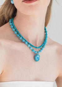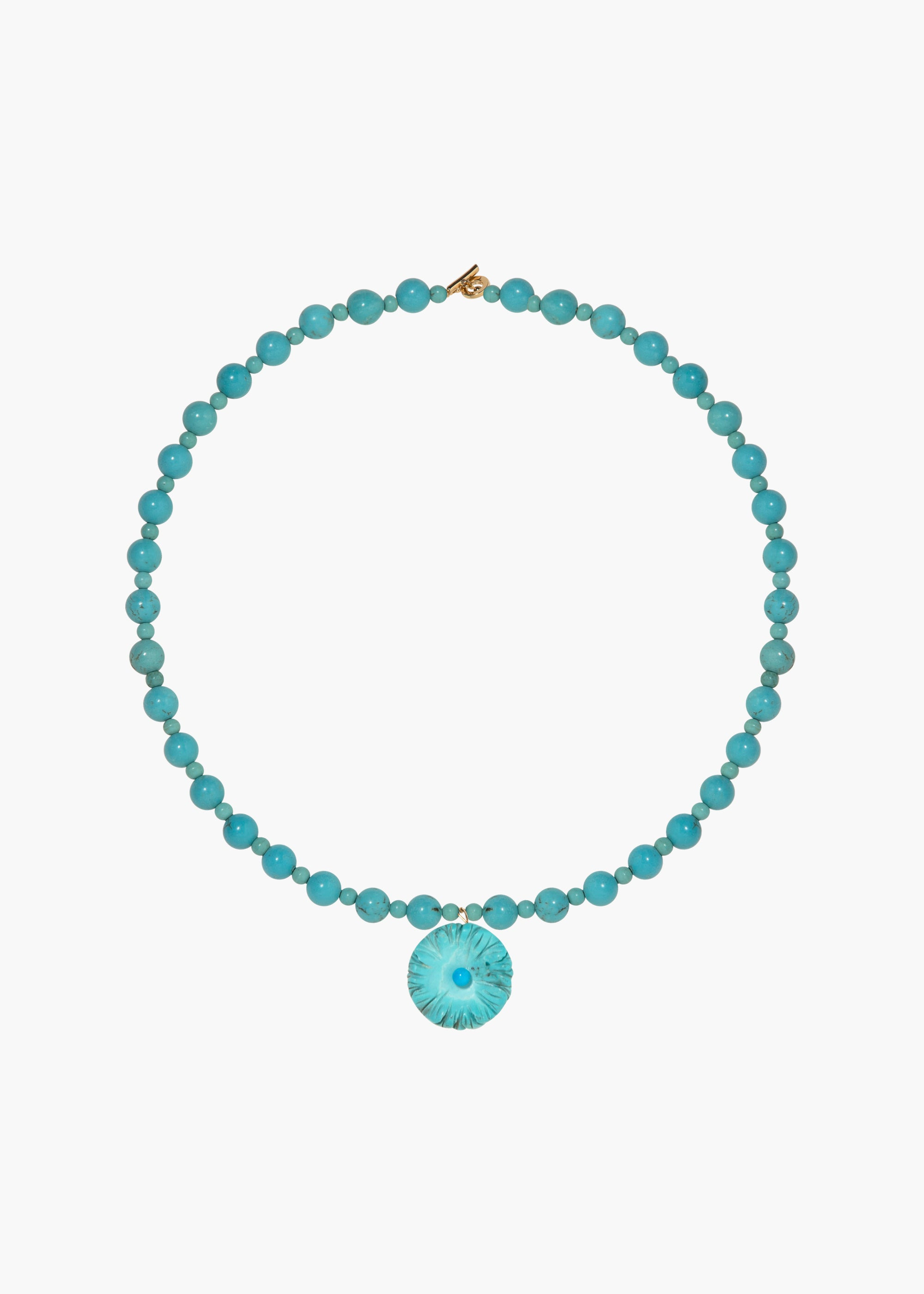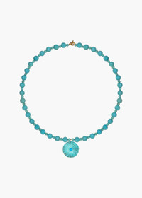 Hand-beaded with semi-precious turquoise stones in alternating sizes, the Chanda Necklace is a breath of fresh air. The flower drop is carved by hand, highlighting the innate variations in the natural stones that make each one unique. Finished with an 18-karat gold-plated T-bar clasp, this necklace is designed to be mixed and layered with other pieces in our Semi-Precious Collection. Dimensions: 18" length. Material The Chandra Necklace is handmade in New York of semi-precious stones. Our jewelry is nickel-free and safe for sensitive skin. We recommend storing jewelry in its dust bag while not in use, and avoiding contact with water, perfume, hairspray, and other chemicals.