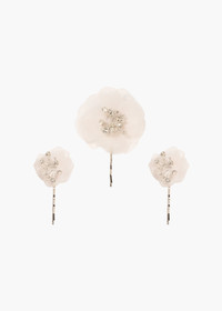 The Chantrell Bobby Pin Set is a set of seven pins, featuring individually hand-cut silk chiffon and organza petals. The juxtaposition of the frothy silk and the striking crystal stamen make these so dimensional, special, and easy to pair with a variety of special-occasion ensembles. This set is beautiful paired with our Kira Hair Magnet Set or the matching Chantrell Barrette. Dimensions: Largest pin: 1 1/8 in height, 1 1/8 in width, 2 in length. Smallest pin: 5/8 in height, 5/8 in width, 2 in length. Material The Chantrell Bobby Pins are a set of 7, assembled by hand in New York of fine Indian hand embroidered silk flowers with Czech crystal stamen centers on rhodium plated durable steel bobby pin, designed to stay firmly in place, once other pins have the hairstyle securely fastened. We recommend treating each pin as you would a piece of jewelry, and storing in the dust bag when not in use. Avoid contact with water, perfume, and other chemicals, including hairspray, which should be used before placement in the hair.
