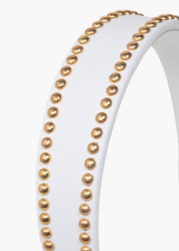With supple lambskin leather and gold-toned stud details, the Chereen Headband is a classic way to elevate any look. Crafted by hand in a leather factory in Brooklyn, each stud is individually placed, using old leather techniques that are rarely seen today. It is grounded by a flexible headband base for comfortable wear. Dimensions: 1.25" width. Material The Chereen Headband is made in New York from genuine lambskin leather, and lined in suede to stay firmly in place while ensuring comfort. We recommend storing headbands in their dust bag while not in use. Avoid contact with water, perfume, and other chemicals, including hairspray, which should be used only before placement in the hair.