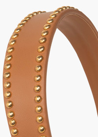 With supple lambskin leather and gold-toned stud details, the Chereen Headband is a classic way to elevate any look. Crafted by hand in a leather factory in Brooklyn, each stud is individually placed, using old leather techniques that are rarely seen today. It is grounded by a flexible headband base for comfortable wear. Material The Chereen Headband is made in New York from genuine lambskin leather, and lined in suede to stay firmly in place while ensuring comfort. We recommend storing headbands in their dust bag while not in use. Avoid contact with water, perfume, and other chemicals, including hairspray, which should be used only before placement in the hair.