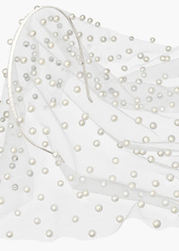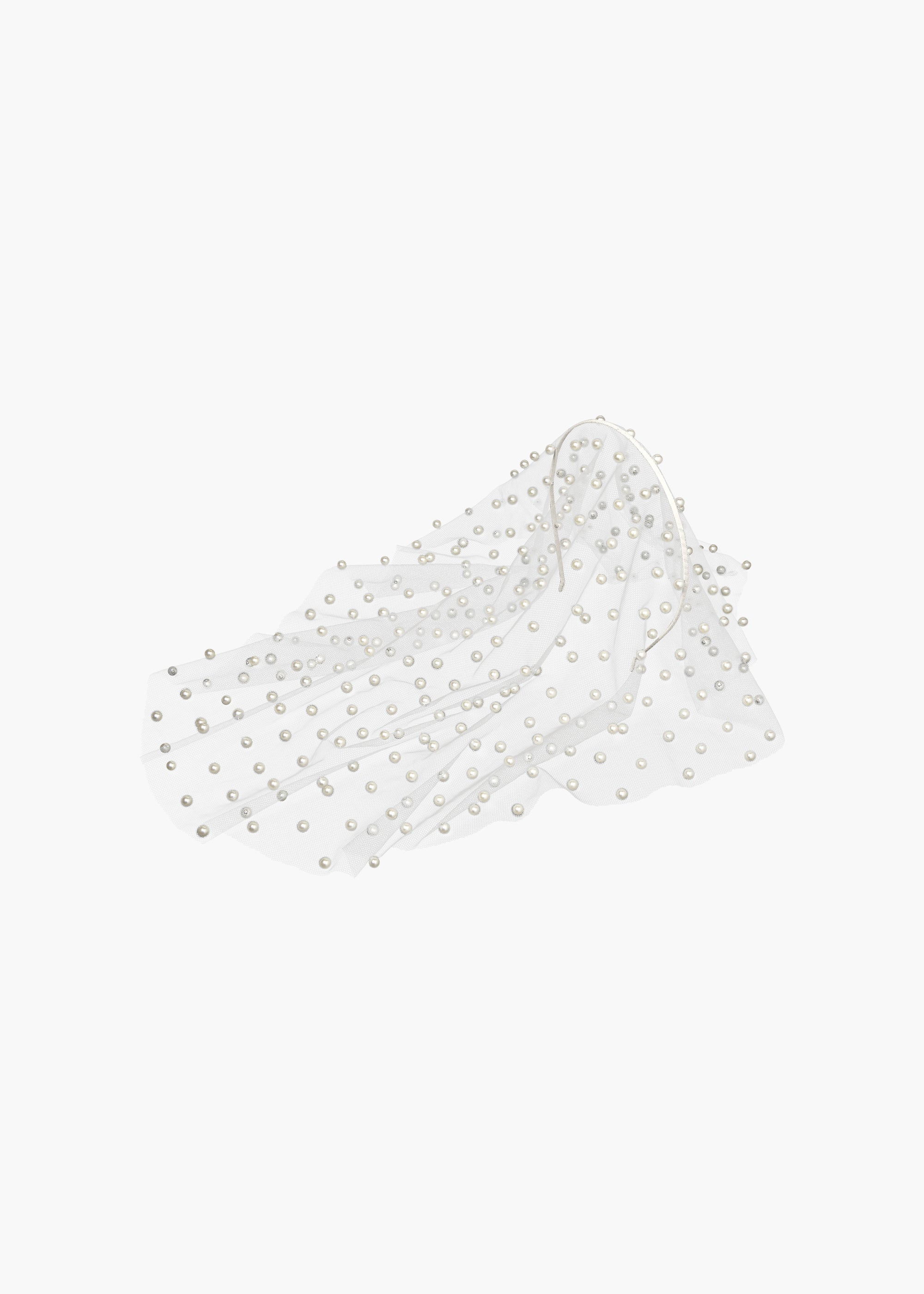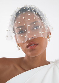The Chiara Veil features shining pearls that are delicately hand-stitched to an ethereal mesh veil, enveloping the face in shimmering opulence. The placement of the peals creates a dramatic, obscured effect, offering a bold reinterpretation of the classic veil that blurs the line between seen and unseen, making every glance unforgettable. Material The Chiara Veil is made by hand in New York from a thin wire headband attached with nylon mesh adorned with poly pearl detailing. We recommend storing voilettes in their dust bag while not in use. Avoid contact with water, perfume, and other chemicals, including hairspray, which should be used only before placement in the hair.