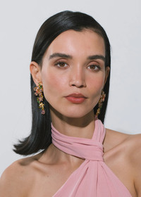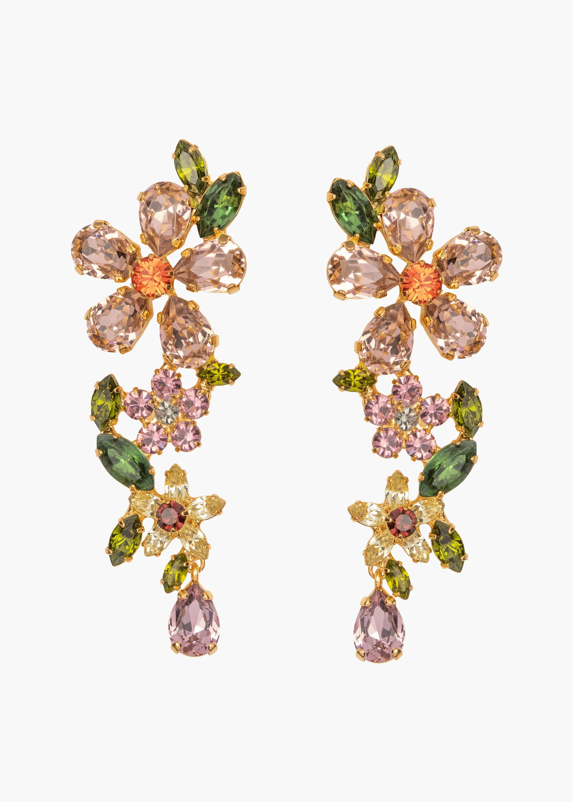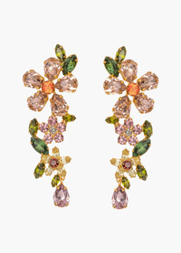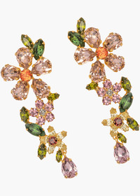 The Cosetta Earrings are a wearable work of art made by hand in New York, referencing the work of innovative floral artists. Pieced together with fine Austrian crystals in an 18-karat gold-plated setting, the stark difference in the flowers' scale creates a sense of depth, cleverly creating the illusion of a three-dimensional bouquet of flowers. Intentionally designed to frame the face, the subtle positioning of each individual element is carefully considered during the design process. Dimensions: 2 3/4in x 1in Material The Cosetta Earrings are made by hand in New York from 18K gold plated brass and Austrian crystals. They have a surgical-steel post, are nickel-free, and safe for sensitive skin. We recommend storing earrings in their dust bag while not in use, and avoiding contact with water, perfume, hairspray, and other chemicals.