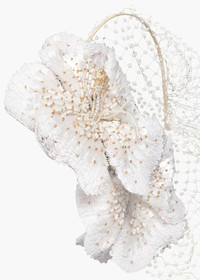 One of our most opulent pieces of modern veiling yet, the Crystal Orchid Voilette is part veil, part headdress. Made entirely by hand, the delicate veil is fully encrusted with pearls and fixed with crystal beaded orchid flowers that sit off to the side as if pinned to the hair. The beaded orchids are anchored by a slender, flexible headband, which disappears into the hair when worn. Material The Crystal Orchid Voilette is made by hand in New York from a nylon mesh fully encrused pearl veil with mix of poly paillettes and a crystal beaded hand created orchid flower. We recommend storing voilettes in their dust bag while not in use. Avoid contact with water, perfume, and other chemicals, including hairspray, which should be used only before placement in the hair.