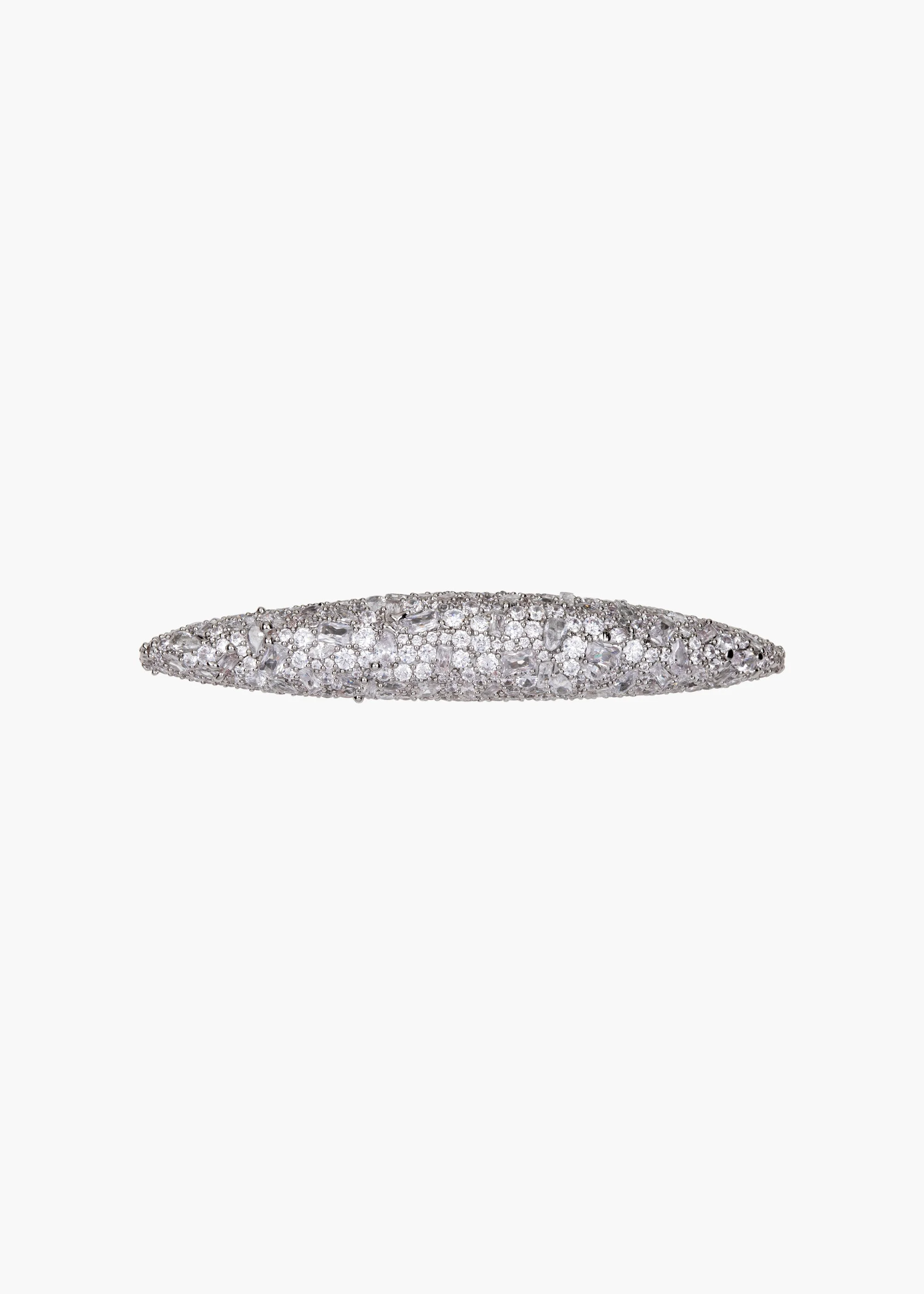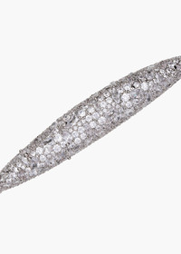Like jewelry for the hair, the Czarina Barrette is fully blanketed in luxurious cubic zirconia pave. Its sprawling shape provides even more surface to sparkle. It fastens with an automatic French barrette clasp for secure placement in the hair. Material The Czarina Barrette is a cubic zirconia crystal pave inset embellishment with a French automatic steele barrette closure. We recommend treating this piece as you would a piece of jewelry, and storing in the dust bag when not in use. Avoid contact with water, perfume, and other chemicals, including hairspray, which should be used before placement in the hair. Imported.