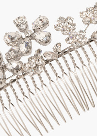 The Danna Comb features oversized florals for a playful take on classic hair comb. Made by hand in New York, the graphic bouquet is formed with fine Czech crystals. It can be styled in a chignon, slipped into a French twist, tucked in the side of the hair, or worn to finish the look of a veil. Dimensions: 3” in height, 7 in length. Material The Danna Comb is made by hand in New York of swarovski crystals, on a steel comb, which is designed to stay firmly in place, once other pins have the hairstyle securely fastened. We recommend treating this comb as you would a piece of jewelry, and storing in the dust bag when not in use. Avoid contact with water, perfume, and other chemicals, including hairspray, which should be used before placement in the hair.
