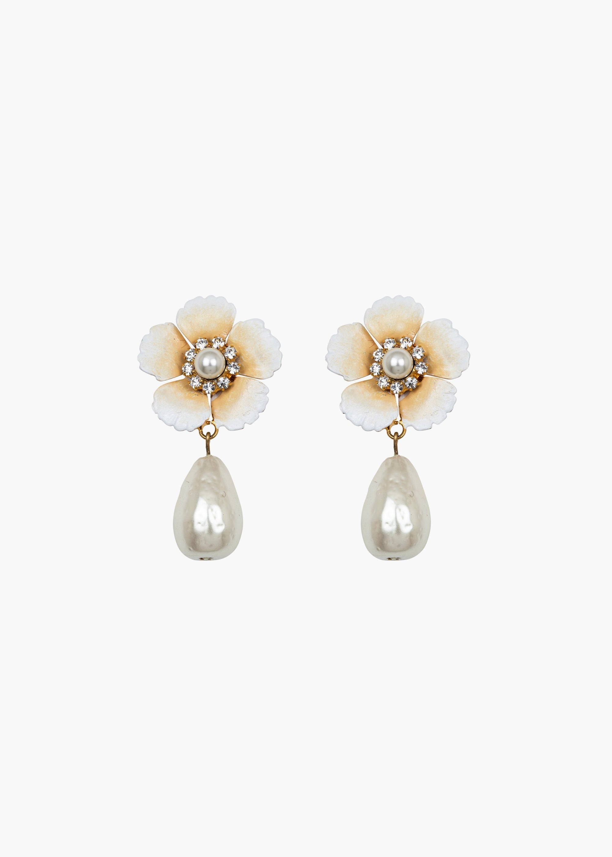 The Deborah Earrings' enticing florals convey the sort of dark romance we always welcome. Made in New York, each flower is individually painted by hand for a one-of-a-kind finish. The look is complete with a baroque-style pearl detail for added movement. Dimensions: 2 inch length Material The Deborah Earrings are made by hand in New York from 18K gold plated brass and crystal pearls and finished with hand-painted details. They have a surgical-steel post, are nickel-free, and safe for sensitive skin. We recommend storing earrings in their dust bag while not in use, and avoiding contact with water, perfume, hairspray, and other chemicals.