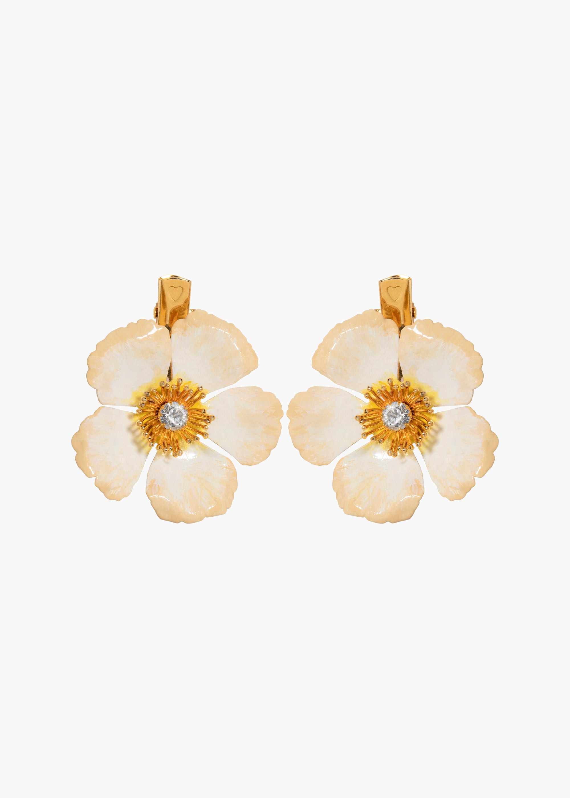 A larger version of our Debbie Clips, the Debreanna Clips are a set of two striking blooms, with exquisite color gradation that brings the flowers to life. To achieve this soft detailing, each flower is painted by hand in our New York studio in a process that takes three days to complete. Each is finished with a crystal center and an alligator clip for secure placement in the hair, and can be layered with multiple sets worn at once, or mixed with the Debbie Clips. Dimensions: 1.75 inch height, 1.75 inch width Material The Debreanna Hair Clips are a set of two and made by hand in New York of hand-painted 18K gold plated brass and Czech crystals with French steel clip closures. We recommend treating these clips as you would a piece of jewelry, and storing in the dust bag when not in use. Avoid contact with water, perfume, and other chemicals, including hairspray, which should be used before placement in the hair.