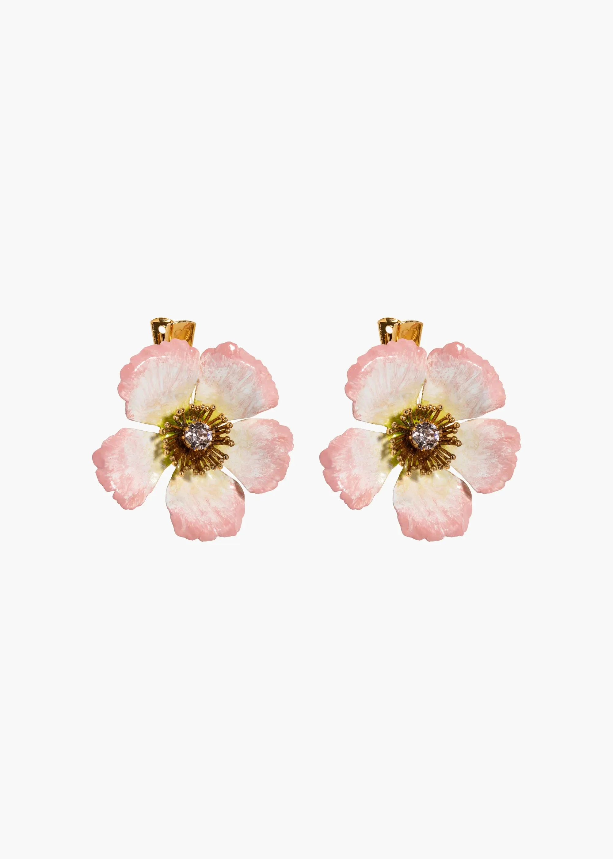 A larger version of our Debbie Clips, the Debreanna Clips are a set of two striking blooms, with exquisite color gradation that brings the flowers to life. To achieve this soft detailing, each flower is painted by hand in our New York studio in a process that takes three days to complete. Each is finished with a crystal center and an alligator clip for secure placement in the hair, and can be layered with multiple sets worn at once, or mixed with the Debbie Clips. Dimensions: 1.75 inch height, 1.75 inch width Material The Debreanna Hair Clips are a set of two and made by hand in New York of hand-painted 18K gold plated brass and Czech crystals with French steel clip closures. We recommend treating these clips as you would a piece of jewelry, and storing in the dust bag when not in use. Avoid contact with water, perfume, and other chemicals, including hairspray, which should be used before placement in the hair.