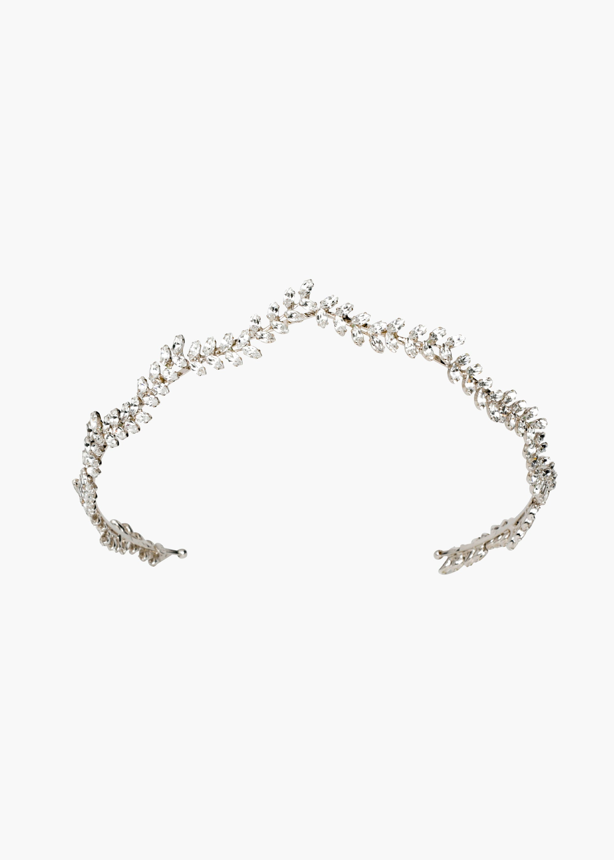Striking in its simplicity, the Delicate Vine Tiara is crafted from Swarovski crystals that create a wreath around the hair. Each crystal is set by hand to not only enhance the sparkle, but create the illusion of glowing crystals floating in the hair. This classic style pairs beautifully with our best-selling Viniette Earrings. Dimensions: 75 inch height Material The Delicate Vine Tiara is made in New York of Swarovski crystal embellishment, on a thin and flexible steel headband, which is custom designed to disappear in the hair and ensure hours of comfort. We recommend treating this headband as you would a piece of jewelry, and storing it in the dust bag when not in use. Avoid contact with water, perfume, and other chemicals, including hairspray, which should be used before placement in the hair.