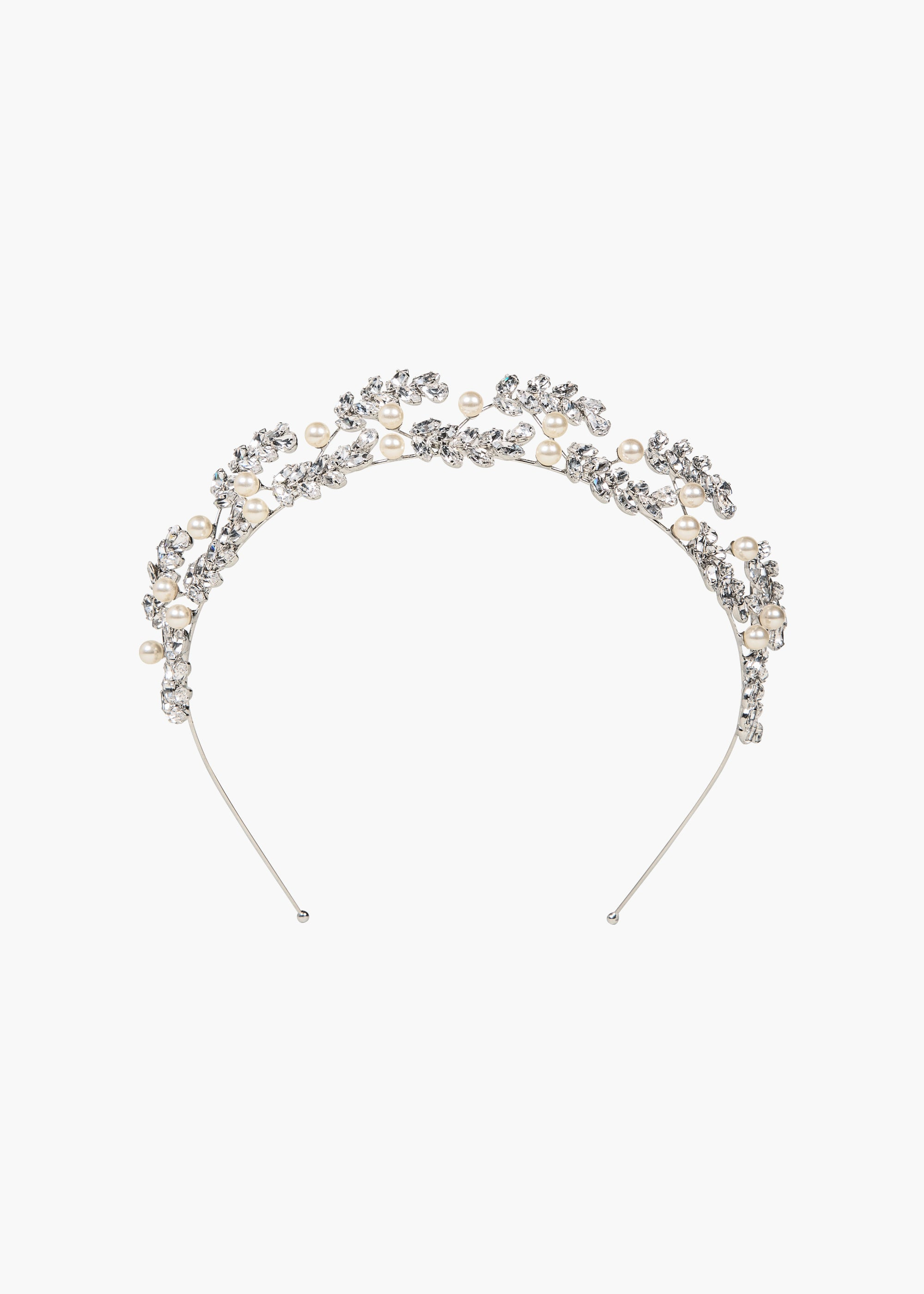 The Delilah Tiara is an outfit-defining headpiece that casts a regal light on all it touches. Arching sprigs of fine crystal leaves create dramatic height, while interspersed pearls complete the harmonious composition. The flexible wire headband base allows for perfect fit and placement. Pair with the matching Verla Earrings . Material The Delilah Tiara is made in New York of 18K gold or rhodium plated brass, crystals, and crystal pearls. We recommend treating this tiara as you would a piece of jewelry, and storing in the dust bag when not in use. Avoid contact with water, perfume, and other chemicals, including hairspray, which should be used before placement in the hair.