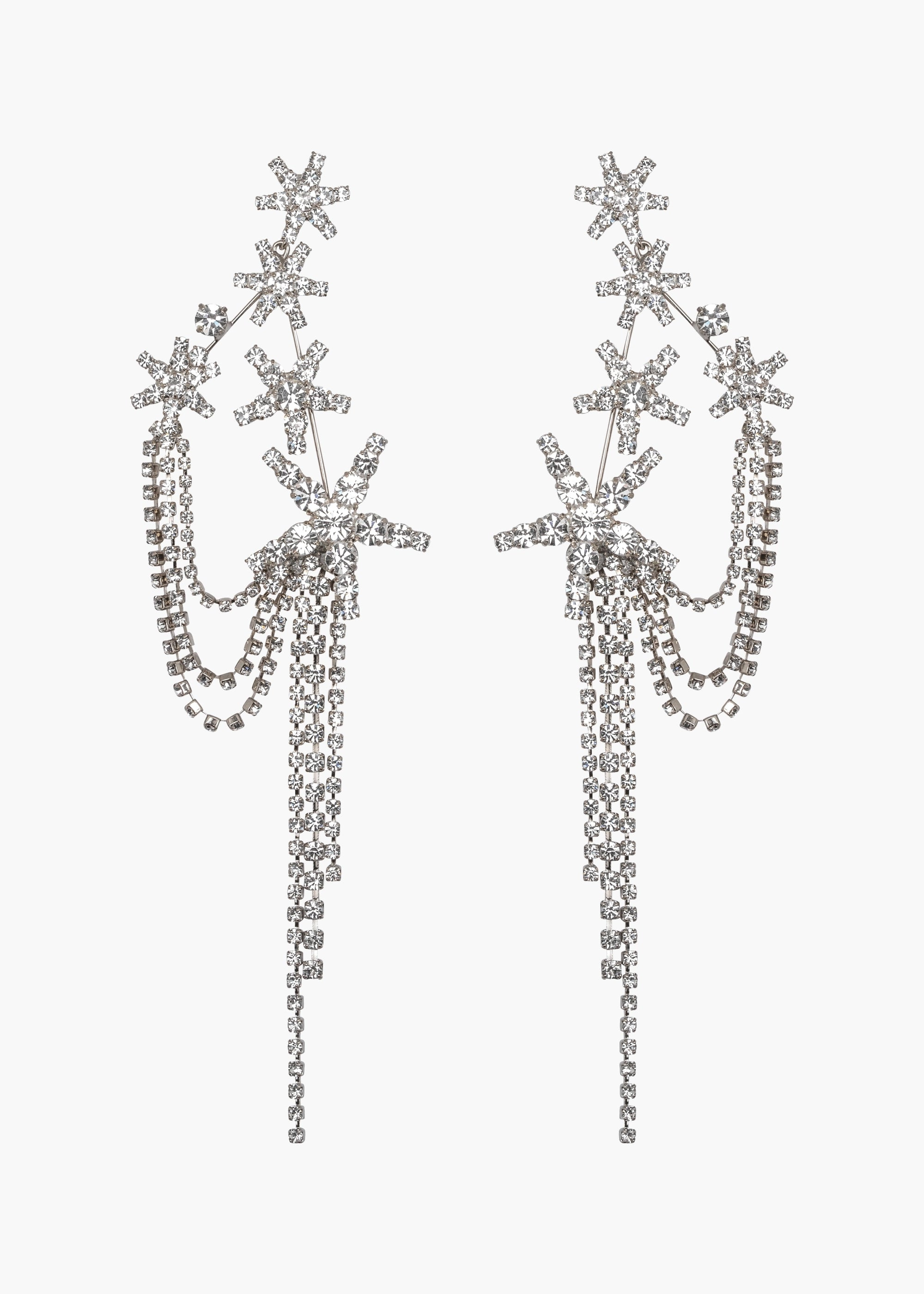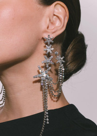 A head-turning statement, the Eliana Earrings feature a constellation of stars, draped with swags of crystal fringe, which moves freely for noteworthy drama. Made by hand in New York, the stars and chains are set with dozens of individual Austrian crystals, backed by a rhodium-plated fine wired setting, which disappears into the night and gives the illusion of stars floating in the sky. The movement of the draped fringe and rich interplay of materials create a dynamic look. Material The Eliana Earrings are made by hand in New York from Austrian crystals and rhodium plated brass. They have a surgical-steel post, are nickel-free and safe for sensitive skin. We recommend storing earrings in their dust bag while not in use, and avoiding contact with water, perfume, hairspray, and other chemicals.