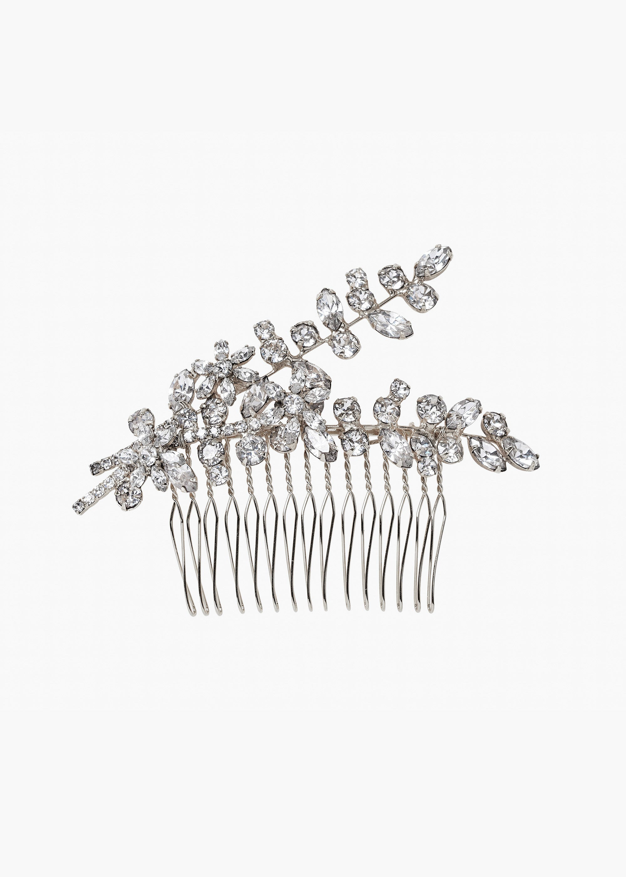 The Elissa Comb features a romantic botanical motif, with Swarovski crystals forming a floral arrangement in the hair. The best part is, this future-heirloom will last much longer than fresh blooms. The Elissa Comb can be worn countless ways, with hair up or down, and can be paired with a veil as well. Dimensions: 4 x 2.25 inches Weight: 25g Material The Elissa Comb is made by hand in New York of Swarovski crystals on a steel comb, which is designed to stay firmly in place, once other pins have the hairstyle securely fastened. We recommend treating this comb as you would a piece of jewelry, and storing in the dust bag when not in use. Avoid contact with water, perfume, and other chemicals, including hairspray, which should be used before placement in the hair.