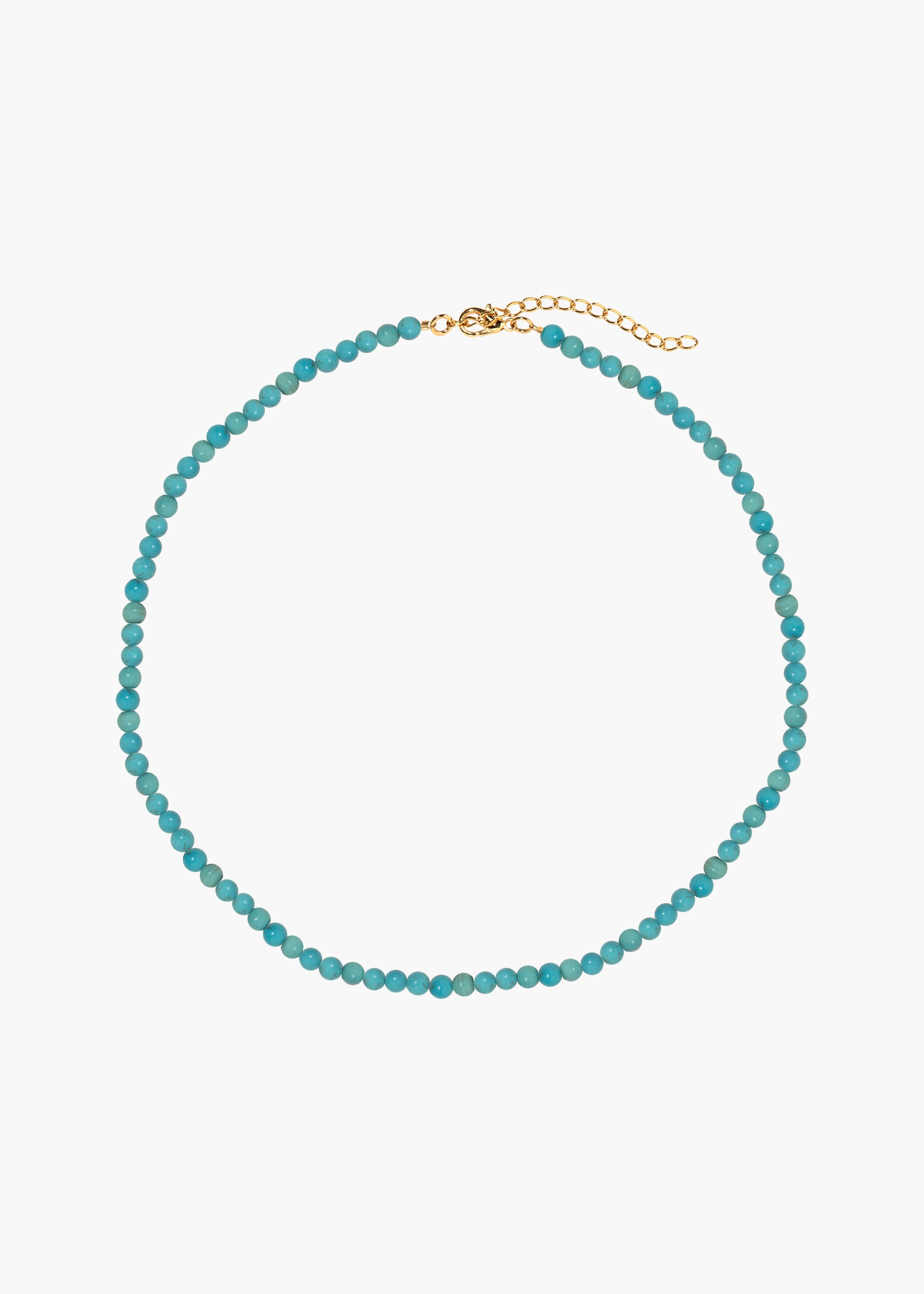 The Ersa Necklace is hand-beaded with semi-precious turquoise stones, forming the ultimate layering piece. Turquoise has been revered for centuries as a stone of protection, said to promote healing and bring success. This necklace is designed to be mixed and stacked with other pieces in our Semi-Precious Collection; the extender at the clasp makes it easy to adjust and achieve the desired length, especially when layering with other necklaces. Dimensions: 16" length with 2" extender Material The Ersa Necklace is handmade in New York of semi-precious stones. Our jewelry is nickel-free and safe for sensitive skin. We recommend storing jewelry in its dust bag while not in use, and avoiding contact with water, perfume, hairspray, and other chemicals.