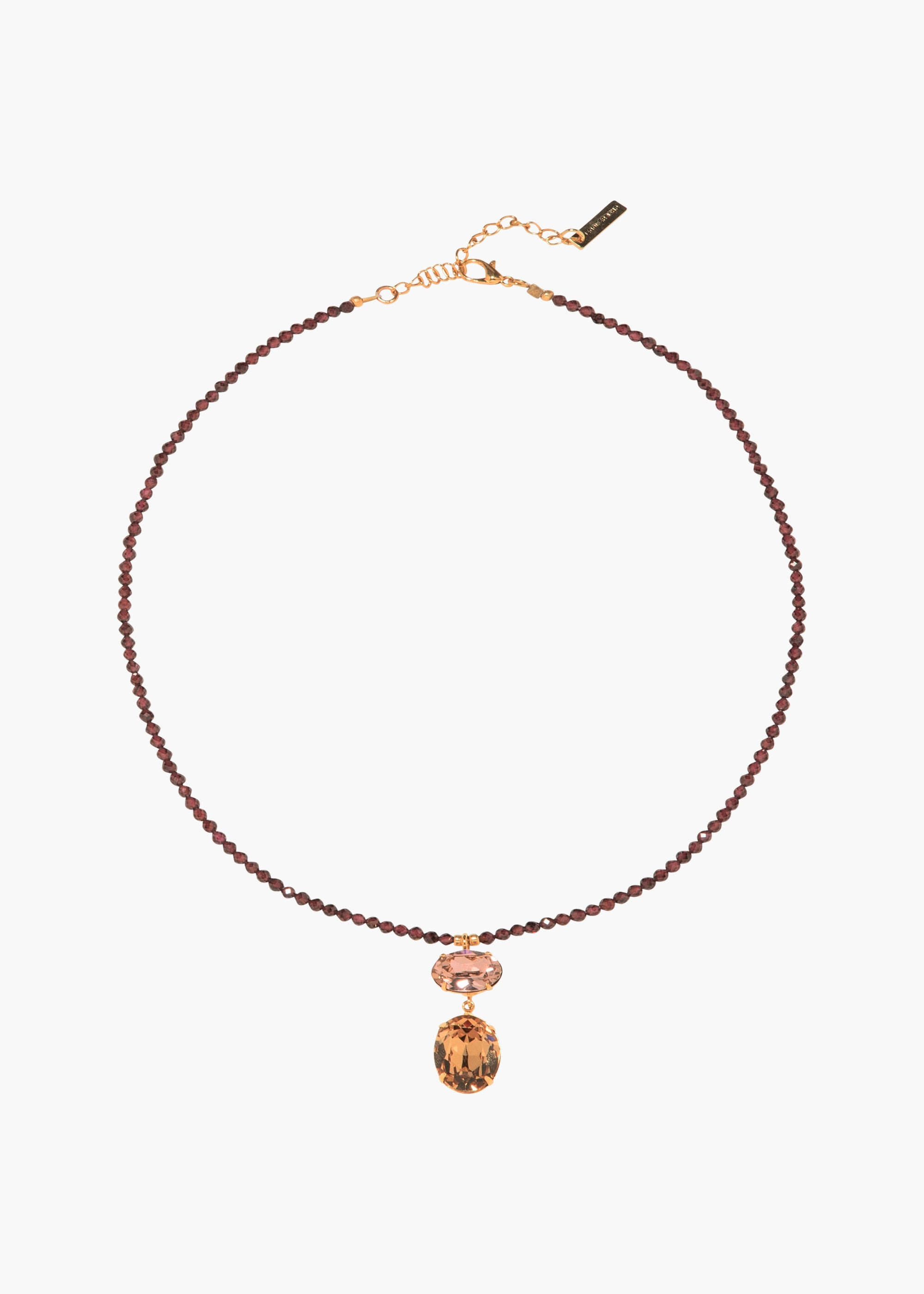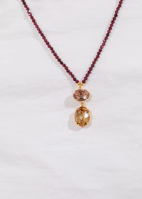 The Freya Necklace is strung with natural semi-precious gemstones and finished with an Austrian crystal pendant, chosen to complement the stones' natural hue. Made by hand in New York, it's finished with an 18-karat gold-plated lobster clasp, with an extender chain to ensure the length hits perfectly with every neckline. The Freya Necklace can be paired with our matching Dara Earrings, or layered with other semi-precious necklaces in our collection. Dimensions: Pendant with jumpring 1.5""x0.5", 21" length Material The Freya Necklace is handmade in New York of faceted semiprecious gemstones with an Austrian crystal pendant and 18K gold plated lobster clasp and two inch extender chain. All stones have natural variances in color and markings that make each one unique. We recommend storing necklaces in their dust bag while not in use, and avoiding contact with water, perfume, hairspray, and other chemicals.