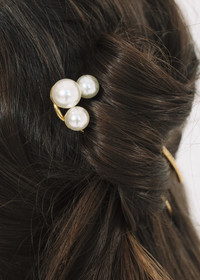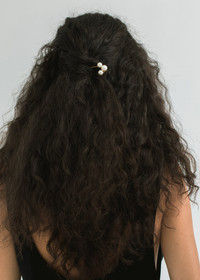 With its clever design, the undeniably-cool Gretel Hair Pin gives the illusion of pearls magically floating in the hair. Each pin is set with a sleek trio of pearls, on a hairpin expertly shaped to stay in place in a range of styles, with any hair type. We love the Gretel Hair Pin paired other pearl hair accessories and earrings, like the Gretel Earrings. Material The Gretel Hair Pin is made in New York of 18K antique gold plated brass and Austrian crystal pearls on a durable light hair pin, designed to stay firmly in place. We recommend treating each pin as you would a piece of jewelry, and storing in the dust bag when not in use. Avoid contact with water, perfume, and other chemicals, including hairspray, which should be used before placement in the hair.