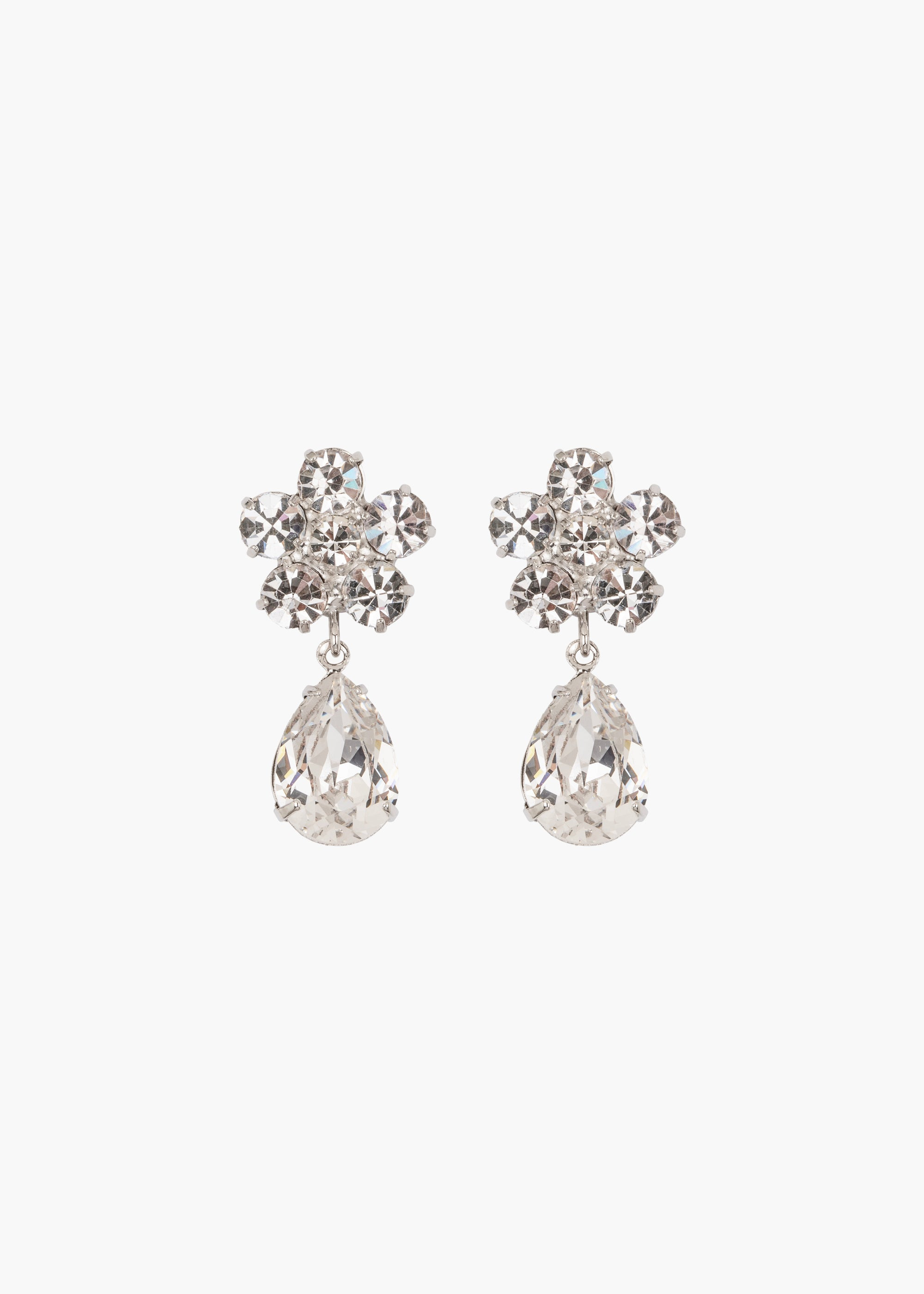 A ditzy floral print in earring form, the Janna Earrings are an ebullient finishing touch. This endlessly wearable style features a crystal flower, with a larger pear-shaped crystal drop. Made by hand in New York, they are thoughtfully crafted to dazzle with your every turn. Dimensions: 1.25" length. Material The Janna Earrings are made by hand in New York from 18K gold plated brass and crystals. They have a surgical-steel post, are nickel-free, and safe for sensitive skin. We recommend storing earrings in their dust bag while not in use, and avoiding contact with water, perfume, hairspray, and other chemicals.