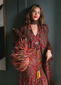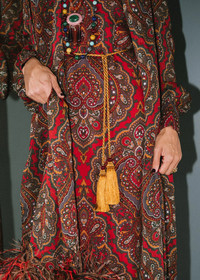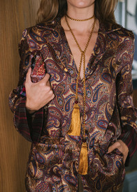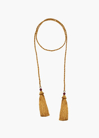 A collaboration between Jennifer Behr and Julia Berolzheimer, the Emberta Necklace draws inspiration from the tactile beauty of home textiles, referencing rich damasks and vintage passementeries. Made by hand in New York, this necklace is crafted of hand-embroidered silk cord, with hand-made silk tassels, semi-precious red jade accent stones, and 18-karat gold-plated details. With endless styling possibilities, this piece's versatility embodies the collection's theme of shifting with the moment—it can be worn around the neck, as a belt, or tied into the hair. The collection was designed so that the pieces could be mixed and layered together to build a visual story. Dimensions: 50" Cord Length and 4" Tassel Length Please note that due to high order volume, we will not be able to process overnight or 2-day shipping for the Julia Berolzheimer collaboration collection. Material The Emberta necklace is hand-embroidered of tonal silk thread rope cord and hand-made silk tassels with red jade accents and 18k gold plated finishings. This piece's comfortable silk construction and length allow it to be worn around the neck, as a belt, or tied into the hair. All stones have natural variances in color and markings that make each one unique. We recommend storing necklaces in their dust bag while not in use, and avoiding contact with water, perfume, hairspray, and other chemicals.