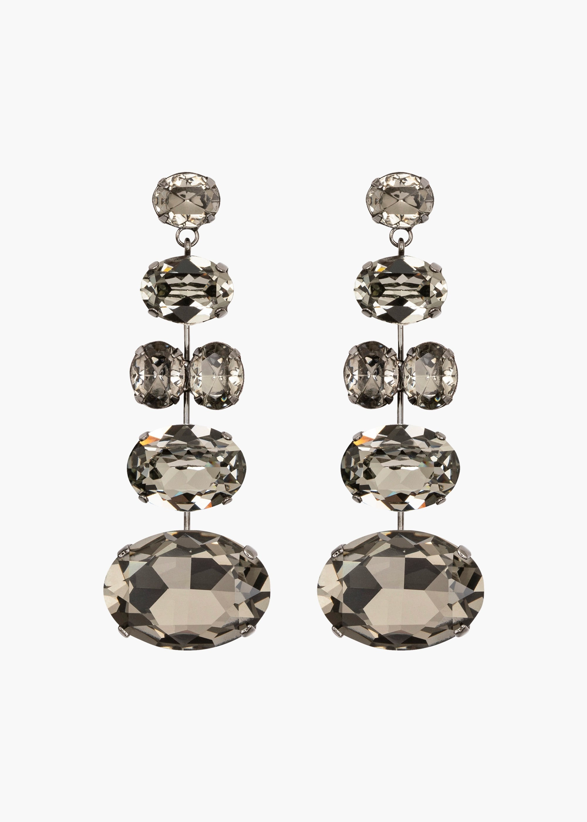 A statement earring that feels utterly fresh, the Joanie Earrings lean into the dichotomy between scale and orientation, subverting design norms. Made by hand in New York, Austrian crystals in a graphite hue imitate black diamonds, with a gunmetal-plated setting emphasizing their dark romance. The linear drop is hinged from the top stone, allowing them to swing like pendulums and cast sparkle in every direction. Dimensions: 3" length Material The Joanie Earrings are made by hand in New York from Austrian crystals and gunmetal plated brass. They have a surgical-steel post, are nickel-free and safe for sensitive skin. We recommend storing earrings in their dust bag while not in use, and avoiding contact with water, perfume, hairspray, and other chemicals.