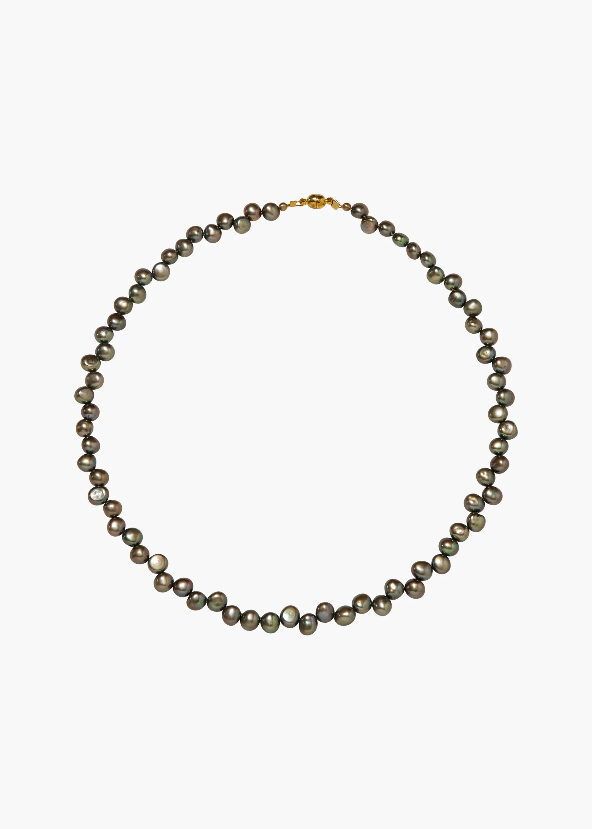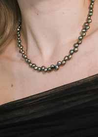 The Josefina Necklace celebrates the unique iridescent black finish of its natural freshwater pearls. Made by hand in New York, we take care to select pearls that sit beautifully together— no two necklaces are entirely alike. It's finished with an 18-karat gold-plated magnetic clasp, making it particularly easy to wear, whether worn solo or layered in a stack. Dimensions: 16.5in x 3/8in Material The Josephina Necklace is handmade in New York of natural freshwater black seed-pearls and 18K gold plated brass magnetic closure. Our jewelry is nickel-free and safe for sensitive skin. We recommend storing necklaces in their dust bag while not in use, and avoiding contact with water, perfume, hairspray, and other chemicals.
