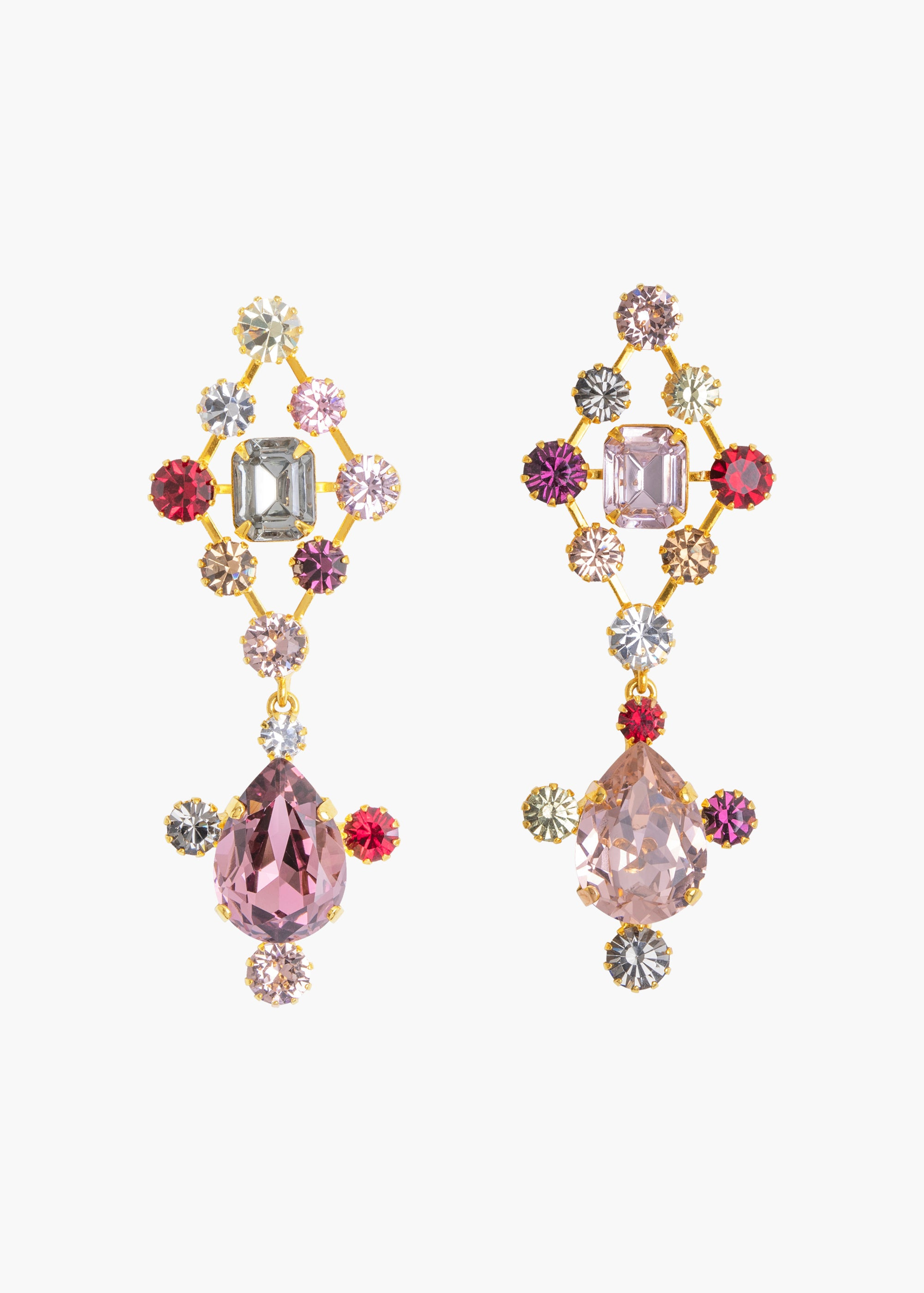 The Jovanne Earrings feature a vibrant mosaic of multicolored crystals, delicately handcrafted in New York. Each earring has its own distinct yet complementary color palette, creating a harmonious asymmetry. The result is a kaleidoscopic vision that adds a dazzling touch of artistry to any ensemble. Material The Jovanne Earring is a post earring with a surgical-steel post. Our earrings are nickel-free and safe for sensitive skin. These earrings are made by hand in New York, from 18K gold plated brass and fine Czech crystals. We recommend storing earrings in their dust bag while not in use, and avoiding contact with water, perfume, hairspray, and other chemicals.