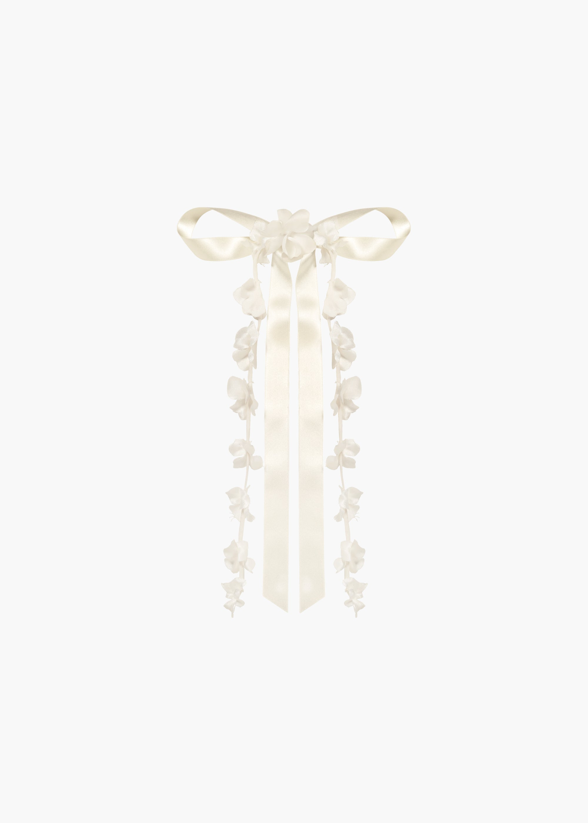 The Juliet Bow Barrette finds our beloved bow awakened by a garland of hand-crafted flowers, like vines of wisteria climbing a trellis. We love the captivating movement of these romantic strands in the hair. Made by hand in our Brooklyn studio, it fastens with an automatic French barrette closure, making it easy to wear in a variety of hairstyles, in any hair type or texture. Material The Juliet Bow Barrette is made by hand in New York of silk satin ribbon with draped florals and a steel French barrette closure. We recommend treating this bow as you would a piece of jewelry, and storing in the dust bag when not in use. Avoid contact with water, perfume, and other chemicals, including hairspray, which should be used before placement in the hair.