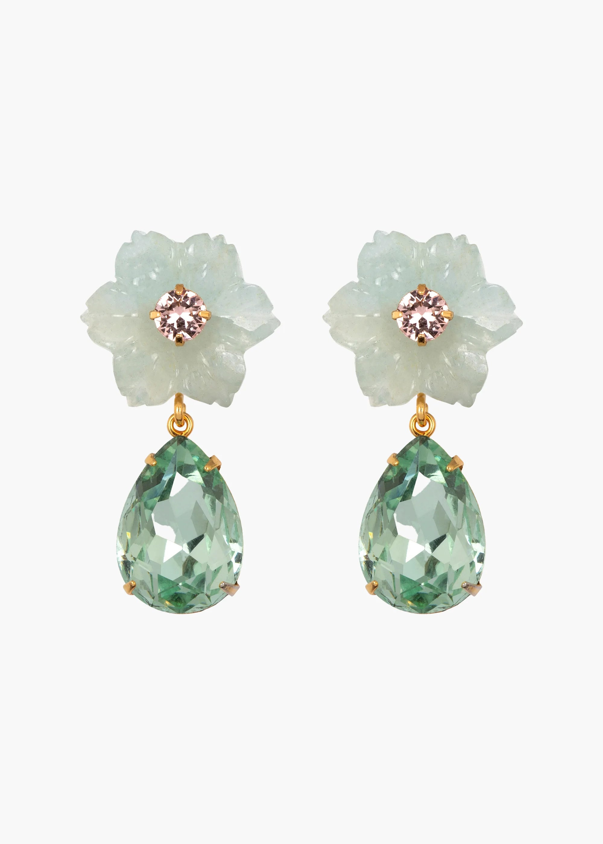 Playfully layering semi-precious gemstones with Austrian crystals, the Juna Earrings are romantic drops, featuring aquamarine, lemon quartz, or blue chalcedony. Made by hand in New York with an 18-karat gold-plated setting, the hand-carved detail on each flower highlights the unique inherent beauty of the organic material— due to natural variations, each pair is one-of-a-kind. The sparkling crystals stand in contrast to the semi-precious stones' ethereal translucence, the mix of transparency and opacity creating rich dimension. Dimensions: 1 5/8in x 3/4in Material The Juna Earrings are made by hand in New York from 18K gold plated brass and a hand-carved semi-precious stone flower with Austrian crystal drops and accents. All stones have natural variances in color and markings that make each one unique. They have a surgical-steel post, are nickel-free, and safe for sensitive skin. We recommend storing earrings in their dust bag while not in use, and avoiding contact with water, perfume, hairspray, and other chemicals.