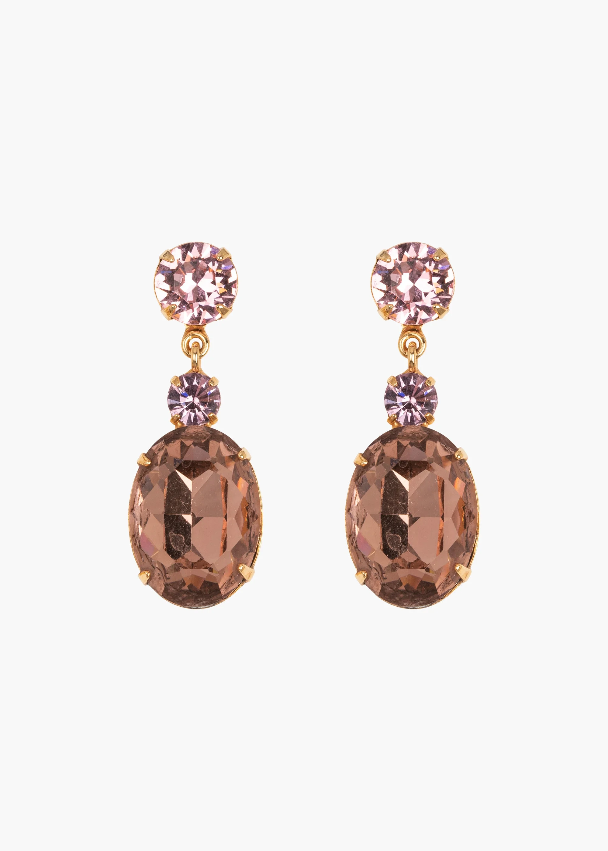 Your Bejeweled Era begins with the Justine Earrings. A pair of stately emerald-cut crystals in complementary hues are separated by a single delicate round stone. These superior drops will remain in constant rotation in your wardrobe for years to come. Material The Justine Earrings are made by hand in New York from 18K gold or rhodium plated brass and crystal. They have a surgical-steel post, are nickel-free, and safe for sensitive skin. We recommend storing earrings in their dust bag while not in use, and avoiding contact with water, perfume, hairspray, and other chemicals.