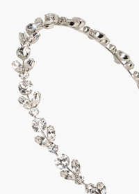 The Kyra Headband has a graceful simplicity that never fails to pull an ensemble together. A garland of flora is crafted from faceted fine crystals, illuminating the face like a halo, with a raised silhouette subtly suggesting the height of a tiara. The fine headband base disappears into the hair, creating the sublime illusion of gems magically afloat. Pair with the matching Marnie Earrings . Material The Kyra Headband is made in New York of rhodium plated brass, crystals, and crystal pearls on a thin and flexible headband, which is designed to disappear in the hair and ensure hours of comfort. We recommend treating this headband as you would a piece of jewelry, and storing in the dust bag when not in use. Avoid contact with water, perfume, and other chemicals, including hairspray, which should be used before placement in the hair.