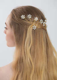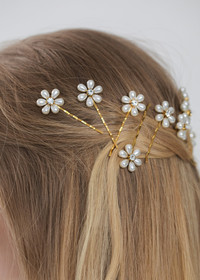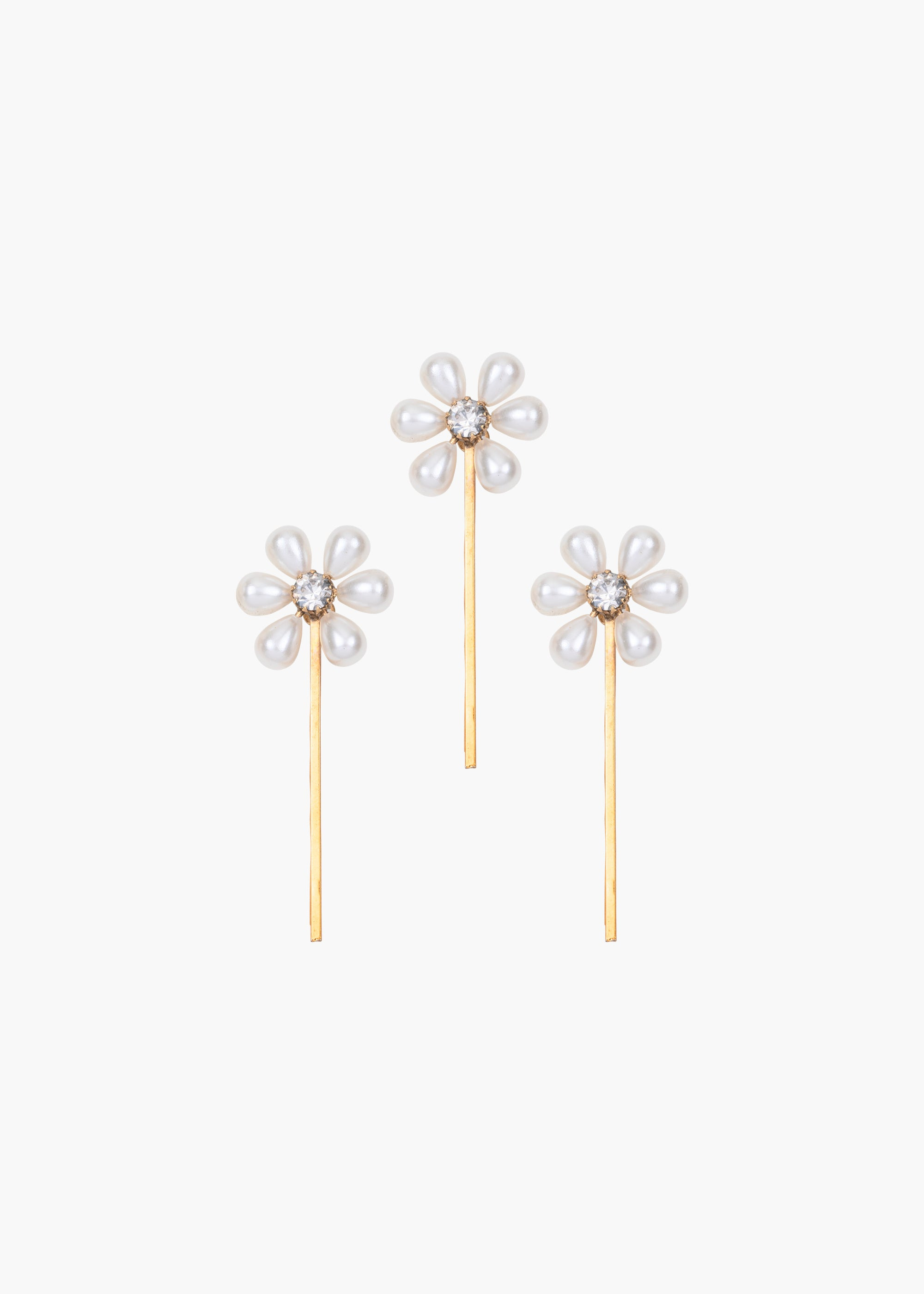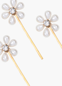 The Laena Bobby Pin Set is a set of three, with hand-set pear-shaped pearl elements forming petals, and a single crystal punctuating the flower's center. Mounted on a sturdy bobby pin that will remain firmly in place, the pins can be tucked into the hair, so that all you see are the pearl flowers, or left exposed for a more relaxed look. This set can be mixed with the Zaya Bobby Pin Set, combining different flowers like a bouquet; add the matching Laena Studs to complete the set. Material The Laena Bobby Pins are a set of 3, made in New York of Czech crystal pearls with crystal centers on a durable steel bobby pin, designed to stay firmly in place, once other pins have the hairstyle securely fastened. We recommend treating each pin as you would a piece of jewelry, and storing it in the dust bag when not in use. Avoid contact with water, perfume, and other chemicals, including hairspray, which should be used before placement in the hair.